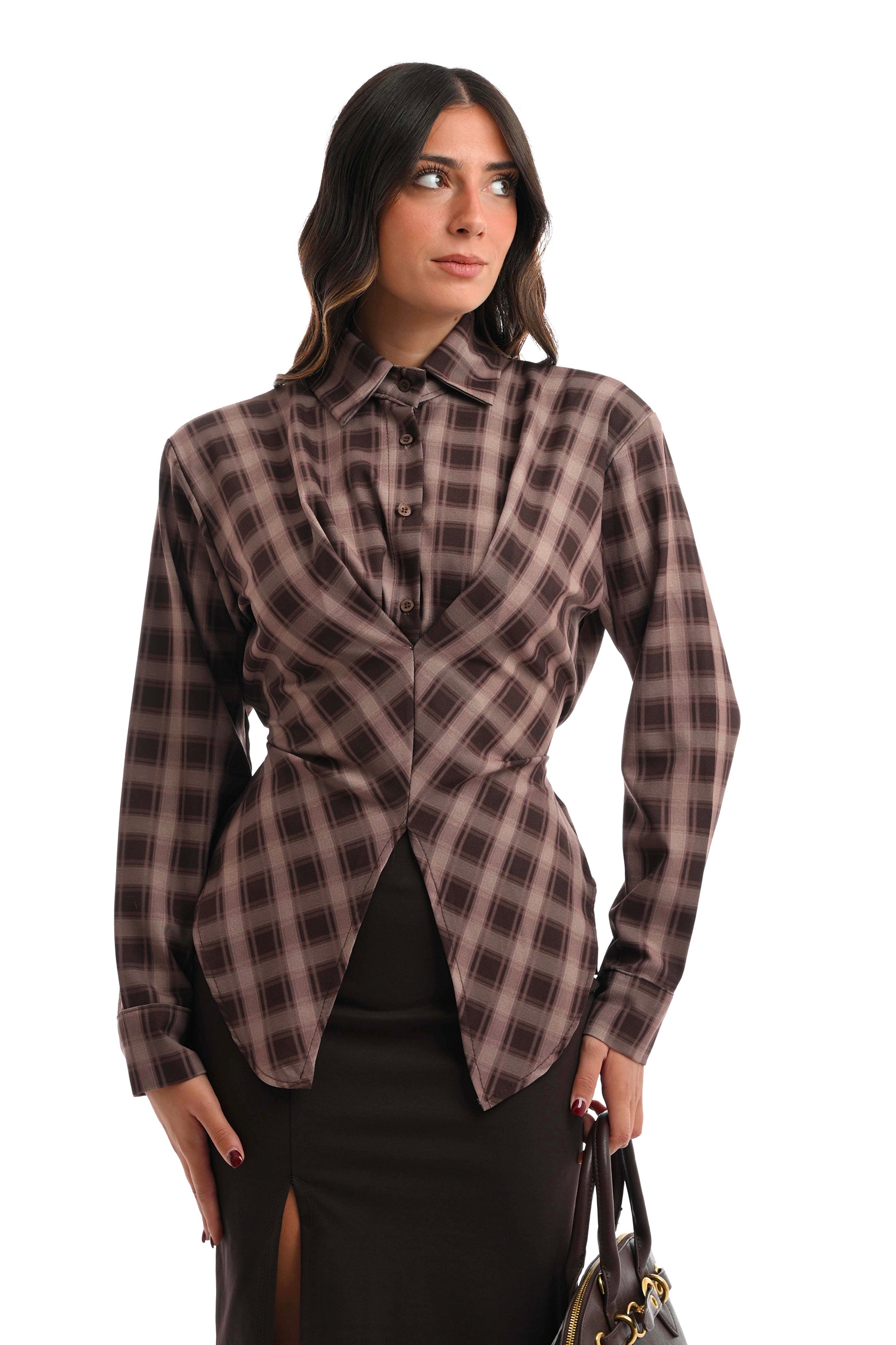 Camicia strutturata e particolare sfondo marrone e nocciola, spallina strutturata e imbottita, allaccio sul retro per regolare il punto vita, taglio vivo e asimmetrico sul fondo, taglia unica che veste 34-44.