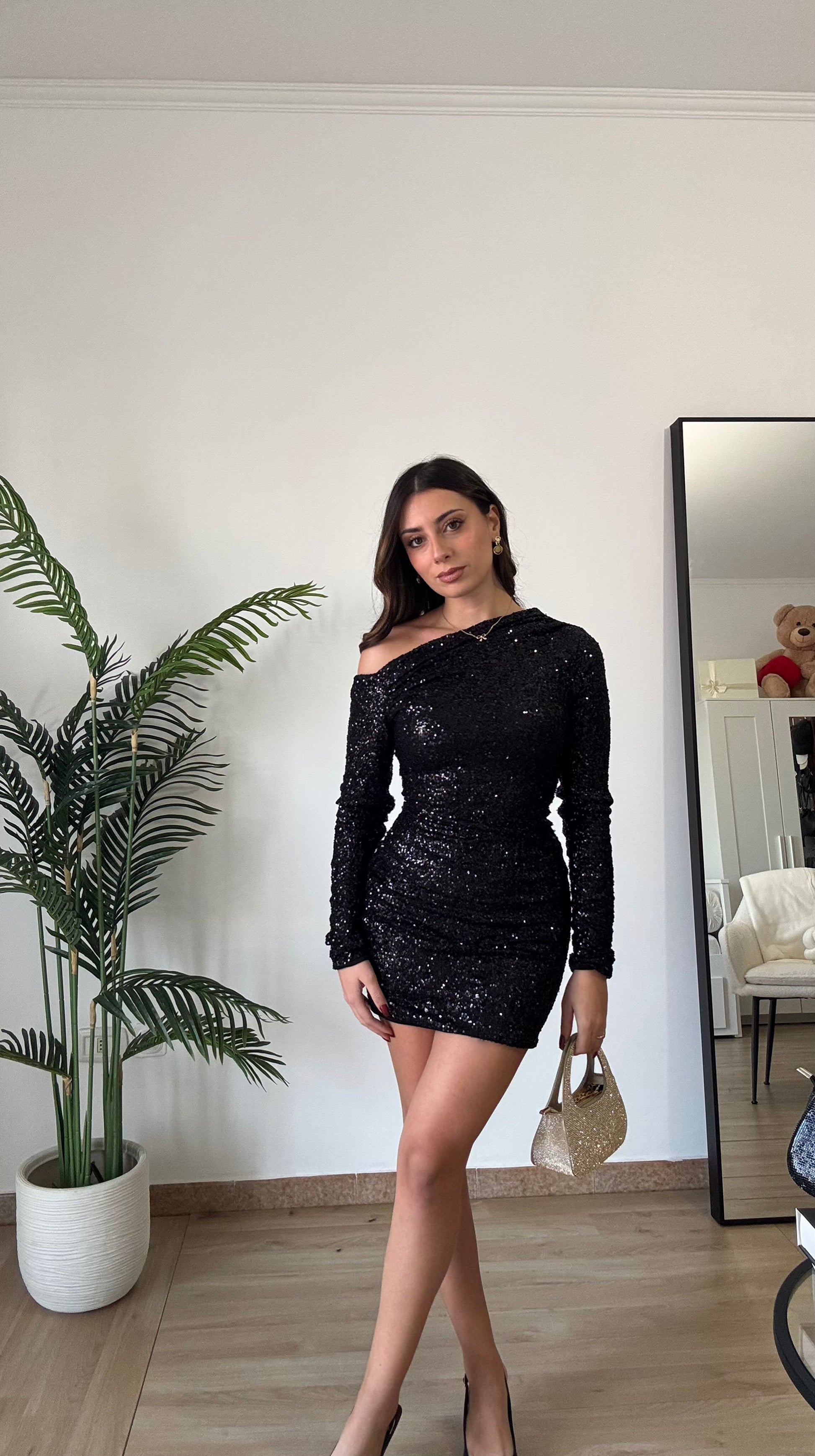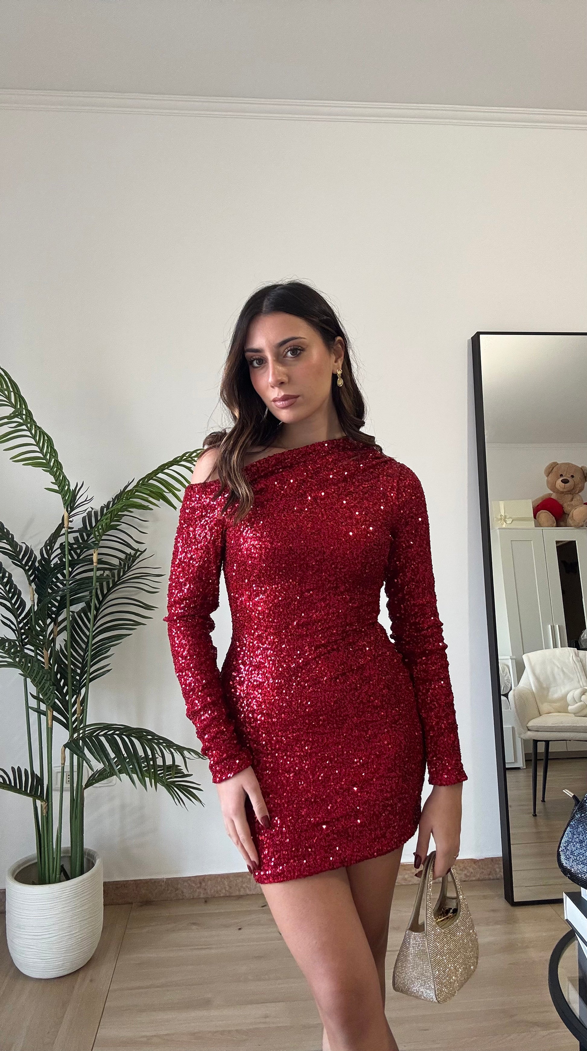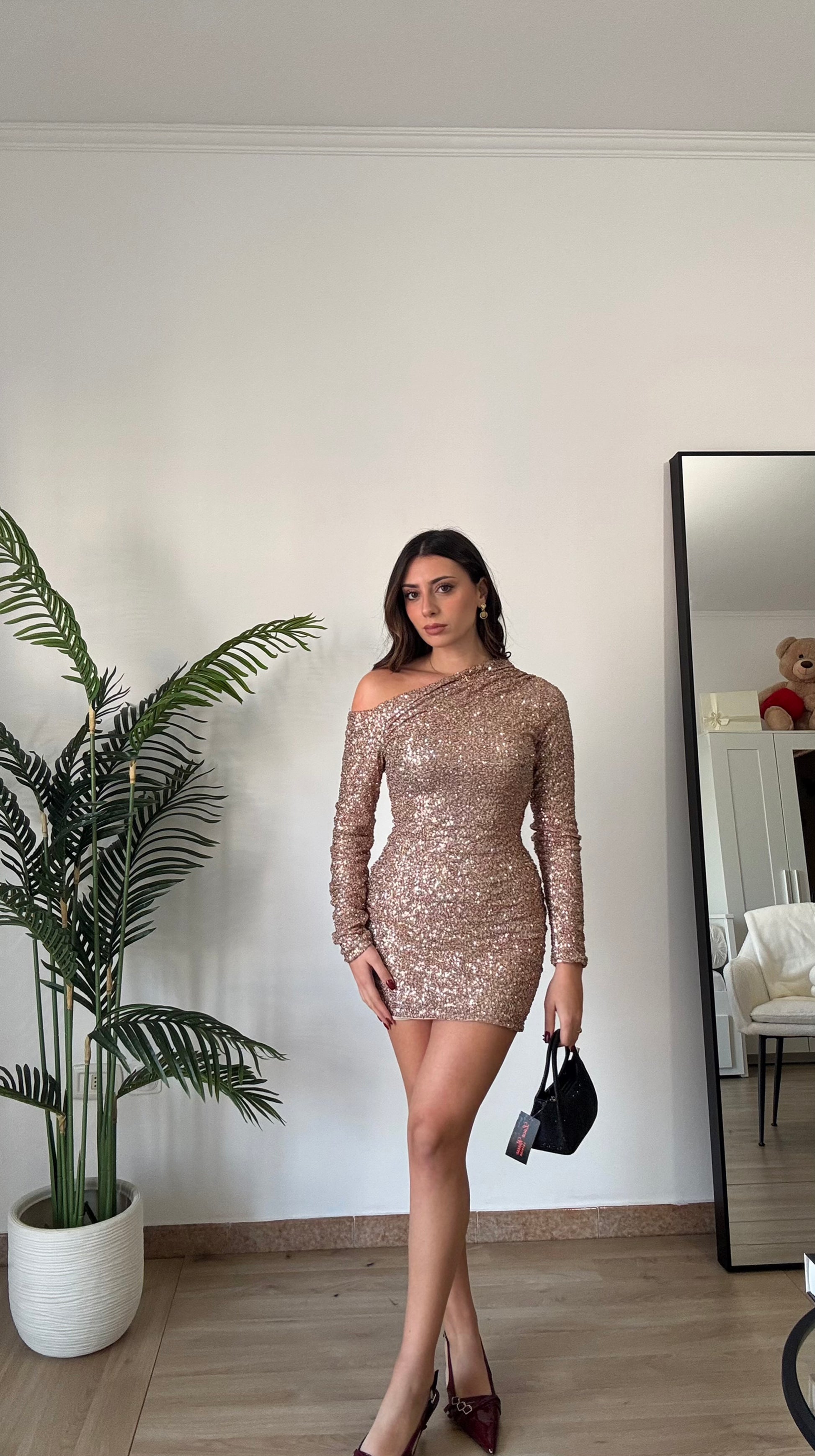 Abito asimmetrico paillettes, taglia unica chd veste 34-42, interno foderato abbastanza pesante.