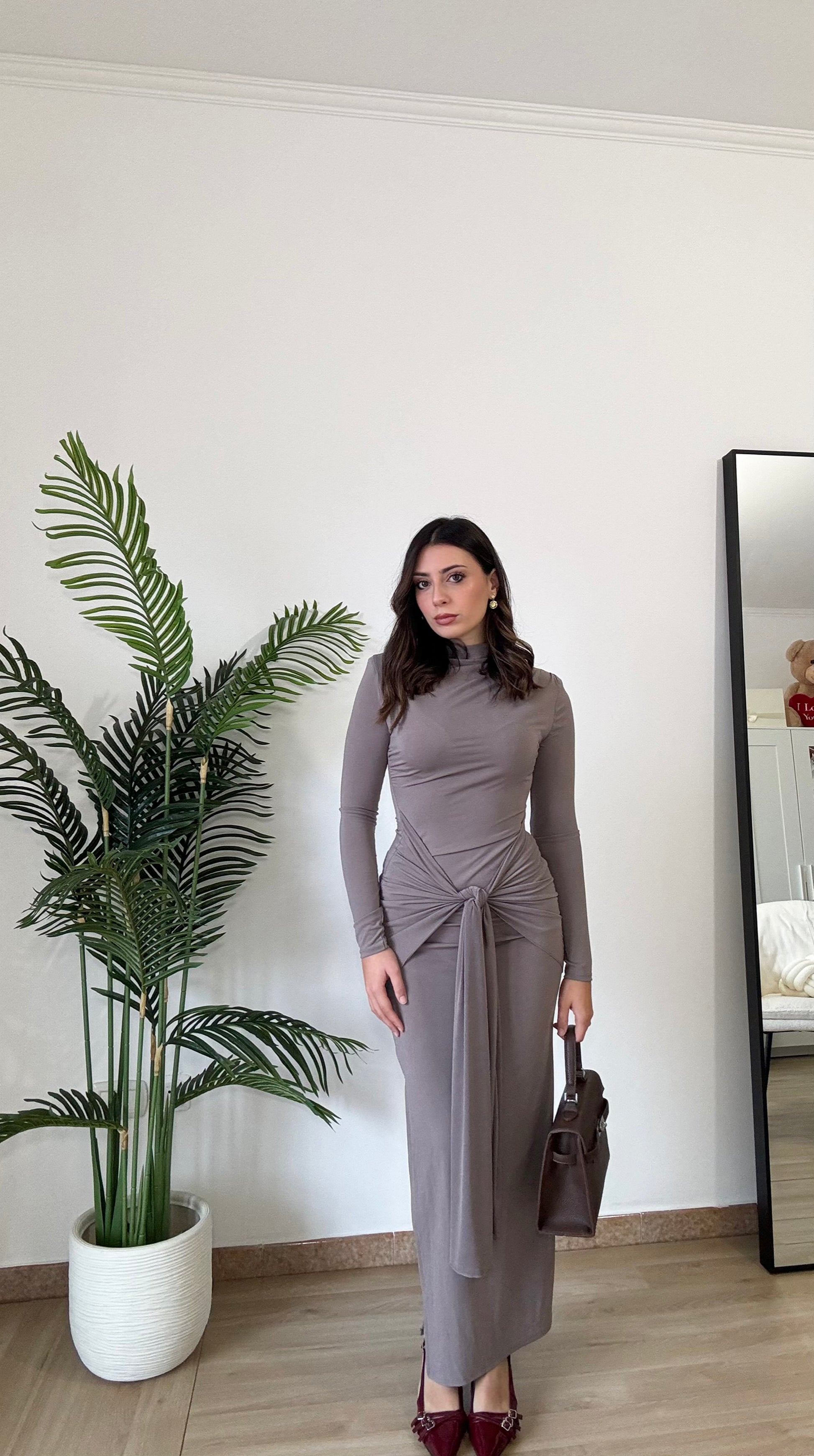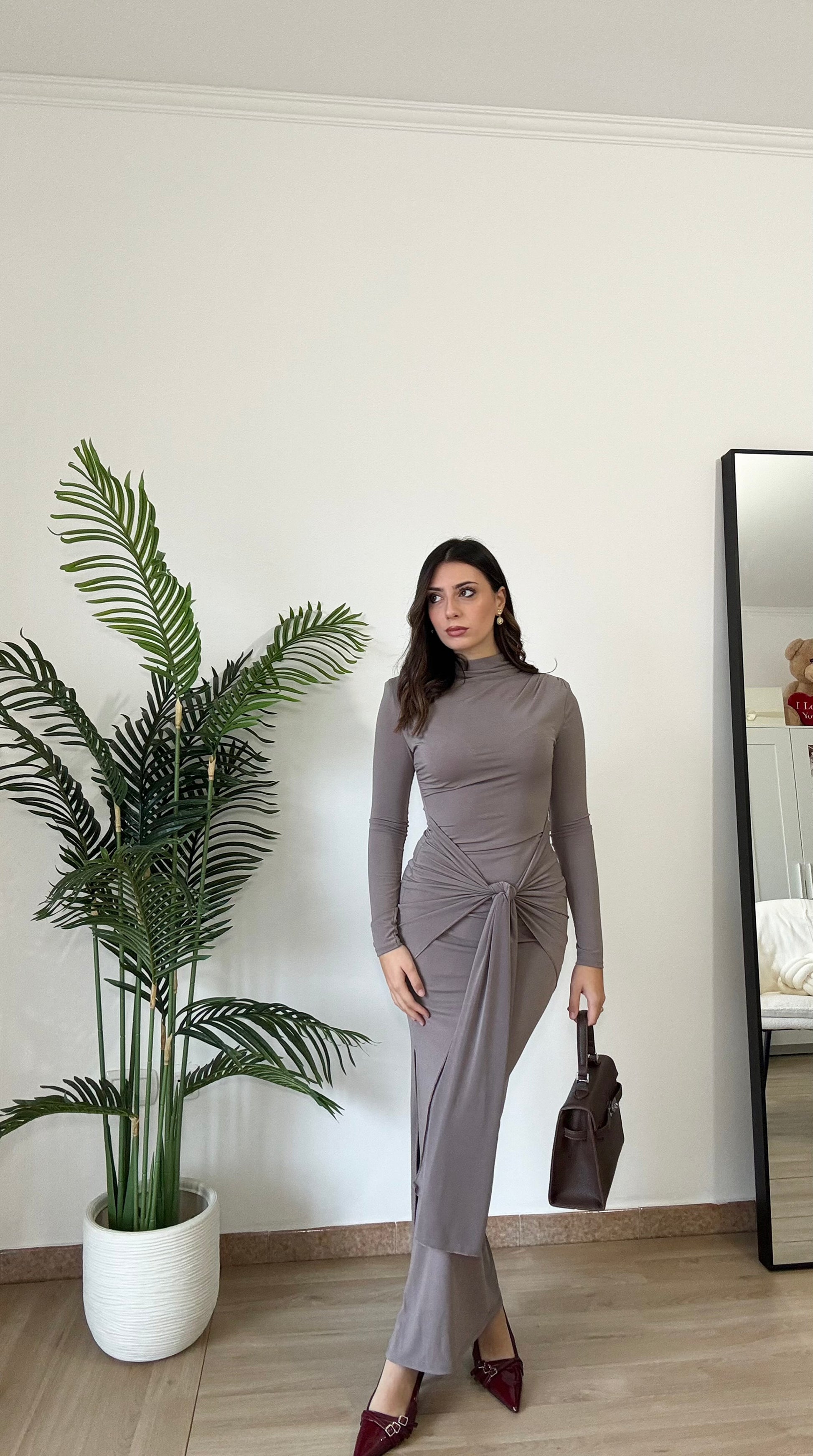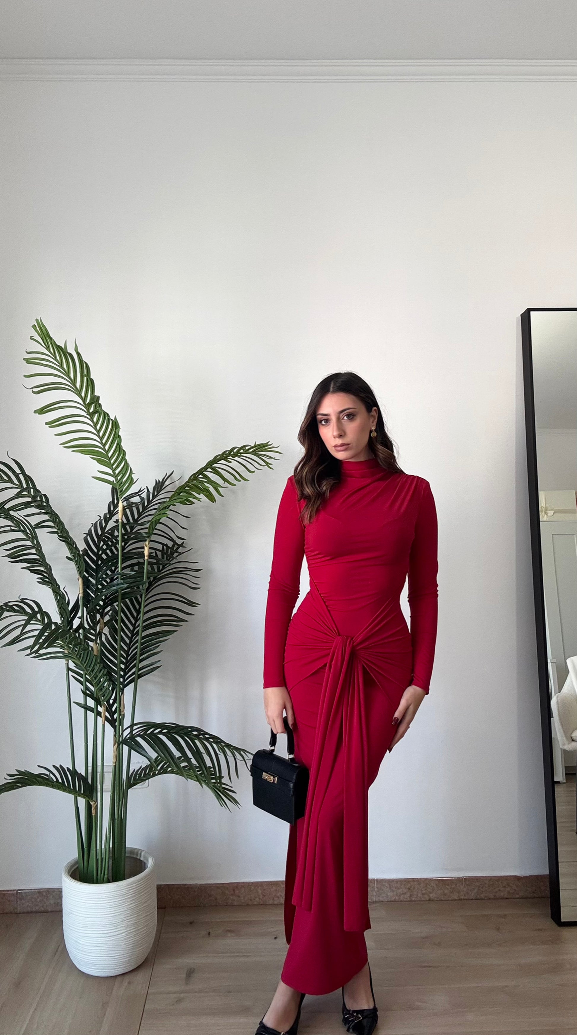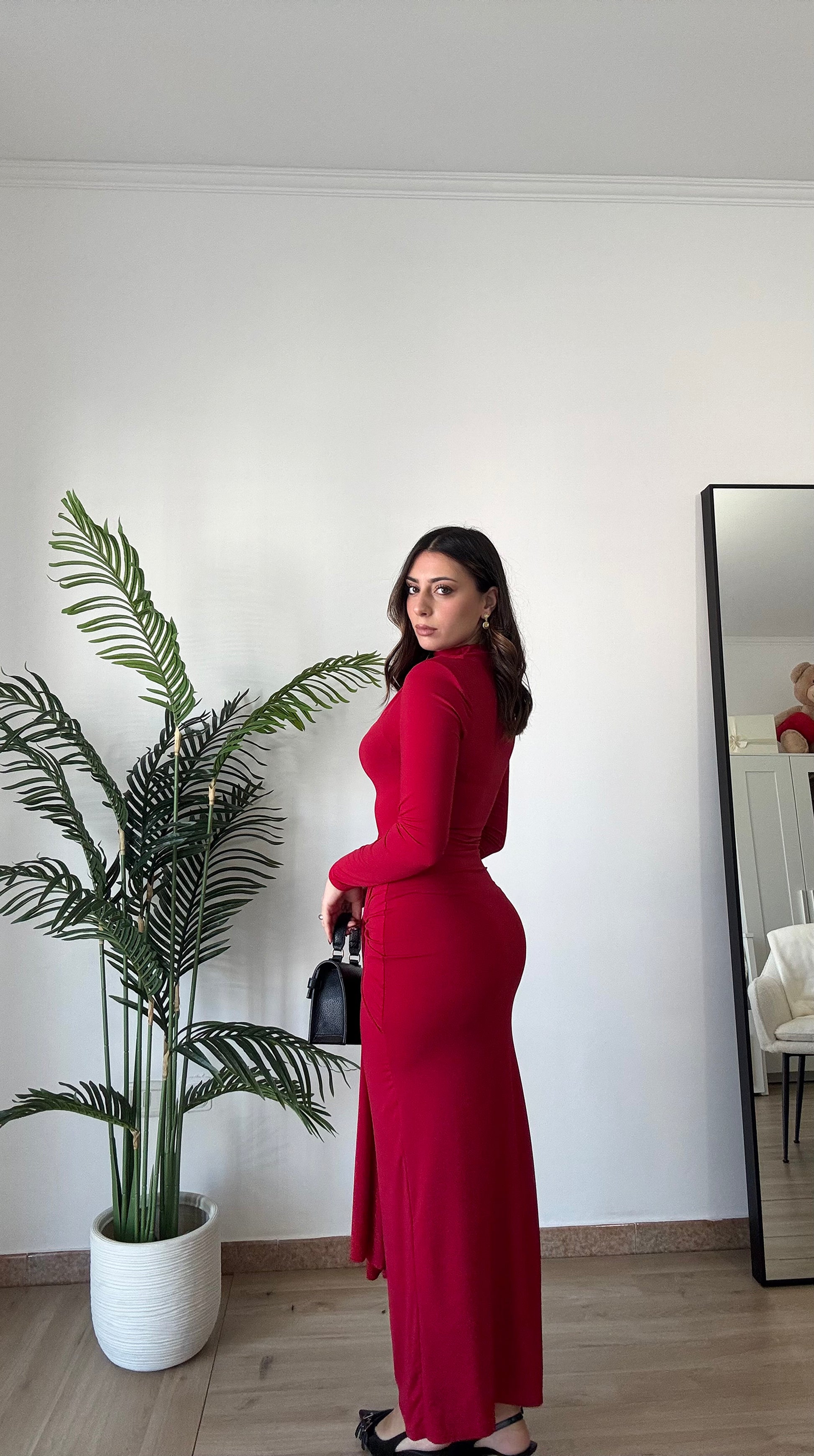 Abito lungo con spacco sulla caviglia, elasticizzato spalle imbottite, taglia unica veste 36-44, regolabile col nodo che troviamo sul davanti.