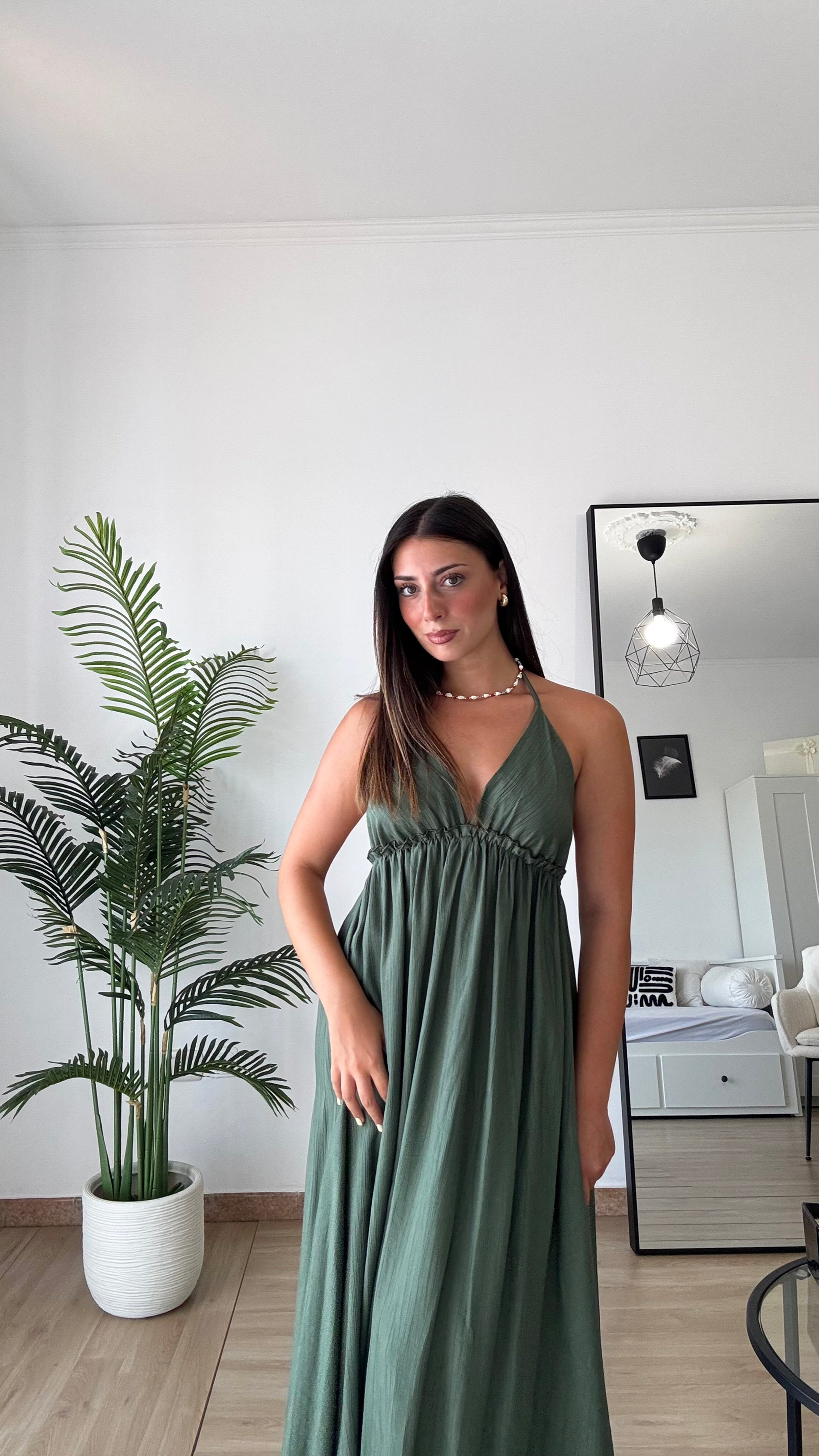 Abito Grace composto dall’87% viscosa, tessuto super leggero e fresco, taglia unica che veste XS-XL, schiena scoperta con elastico sul retro e allaccio al collo regolabile, senza coppe interne.