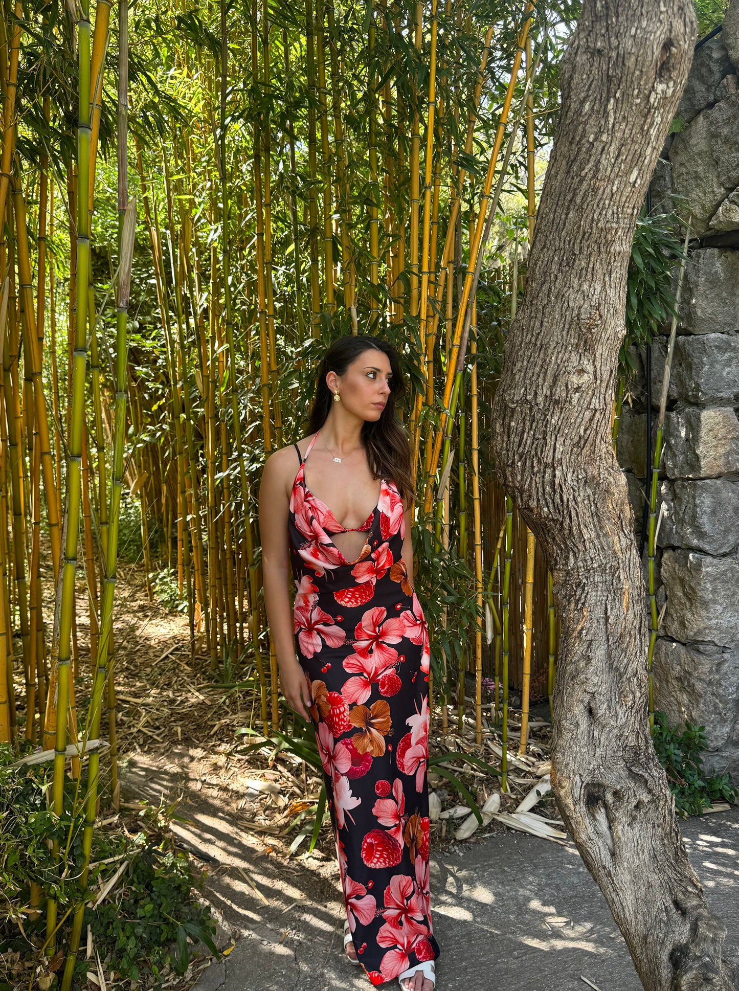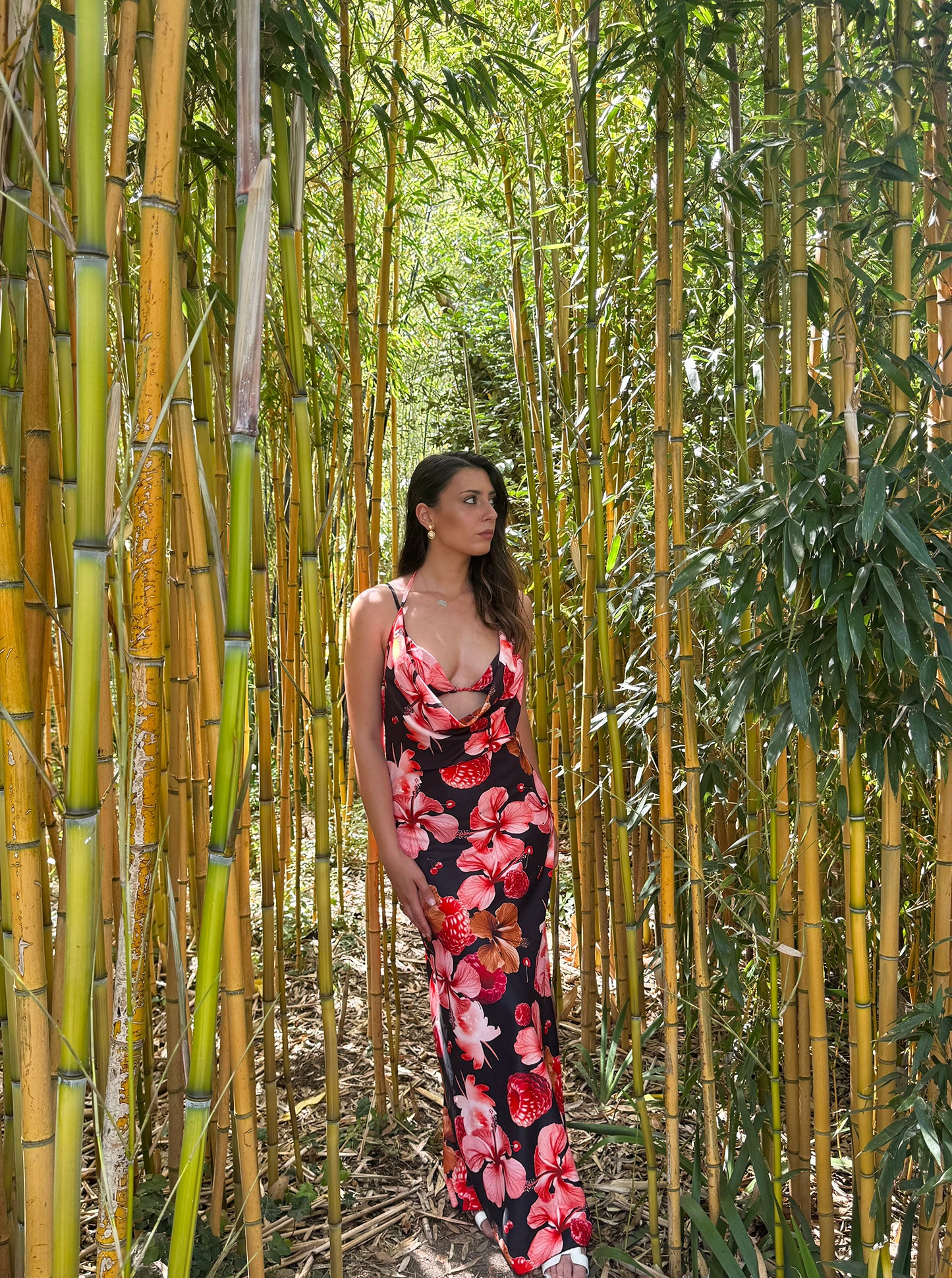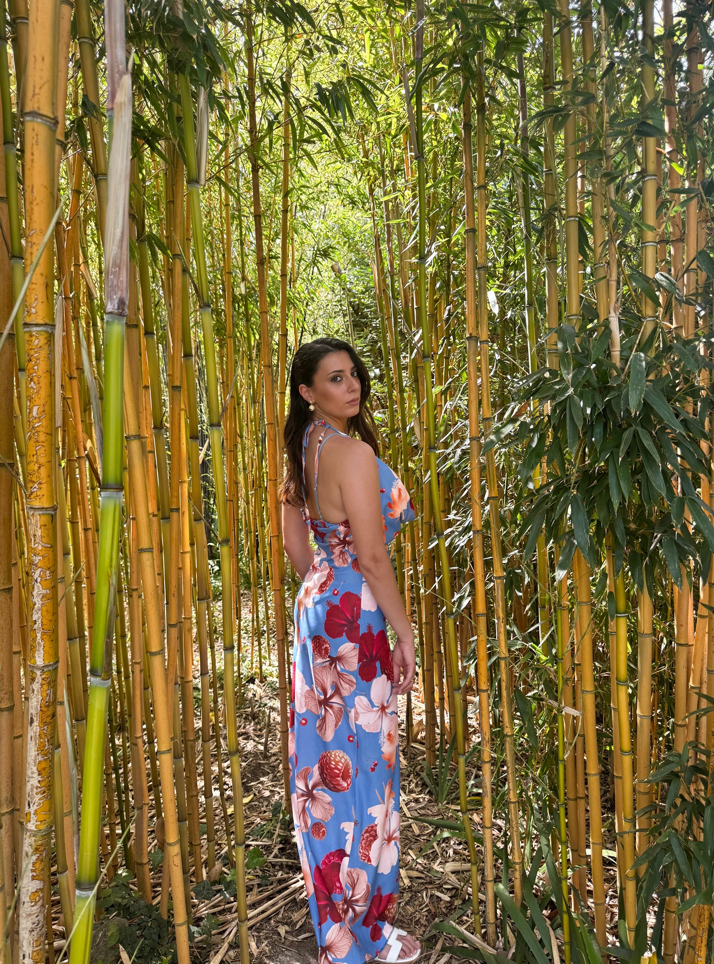 Abito composto da un tessuto super fresco e confortevole, presenta la sua bralette con bretelle regolabili ed elastico sul retro con coppe interne, retro scollato come davanti, taglia unica che veste 34/46.
