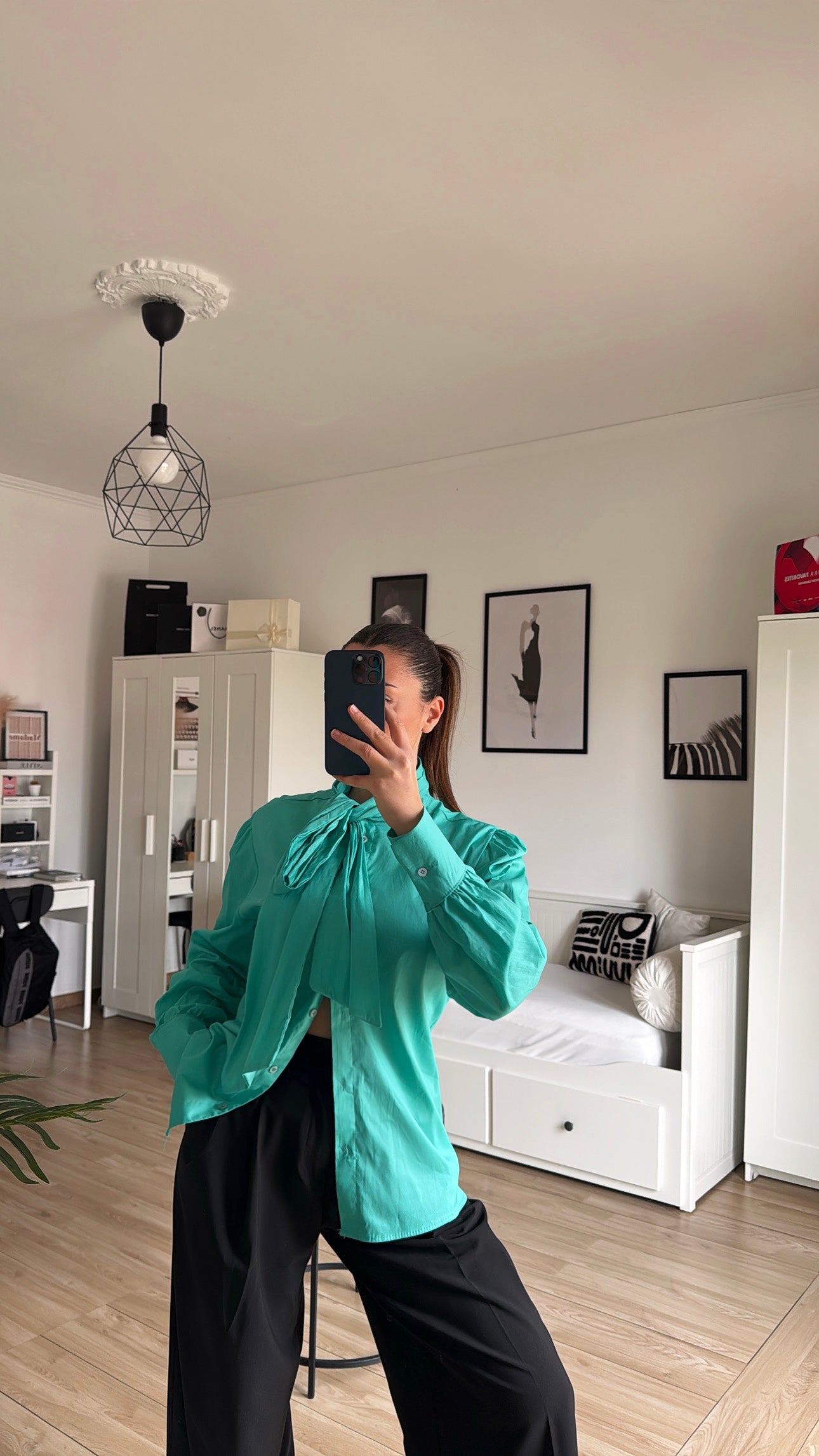 Camicia composta dal 98% COTONE, tessuto super fresco, collo alla coreana con fiocco regolabile, taglia unica che veste 34/46.