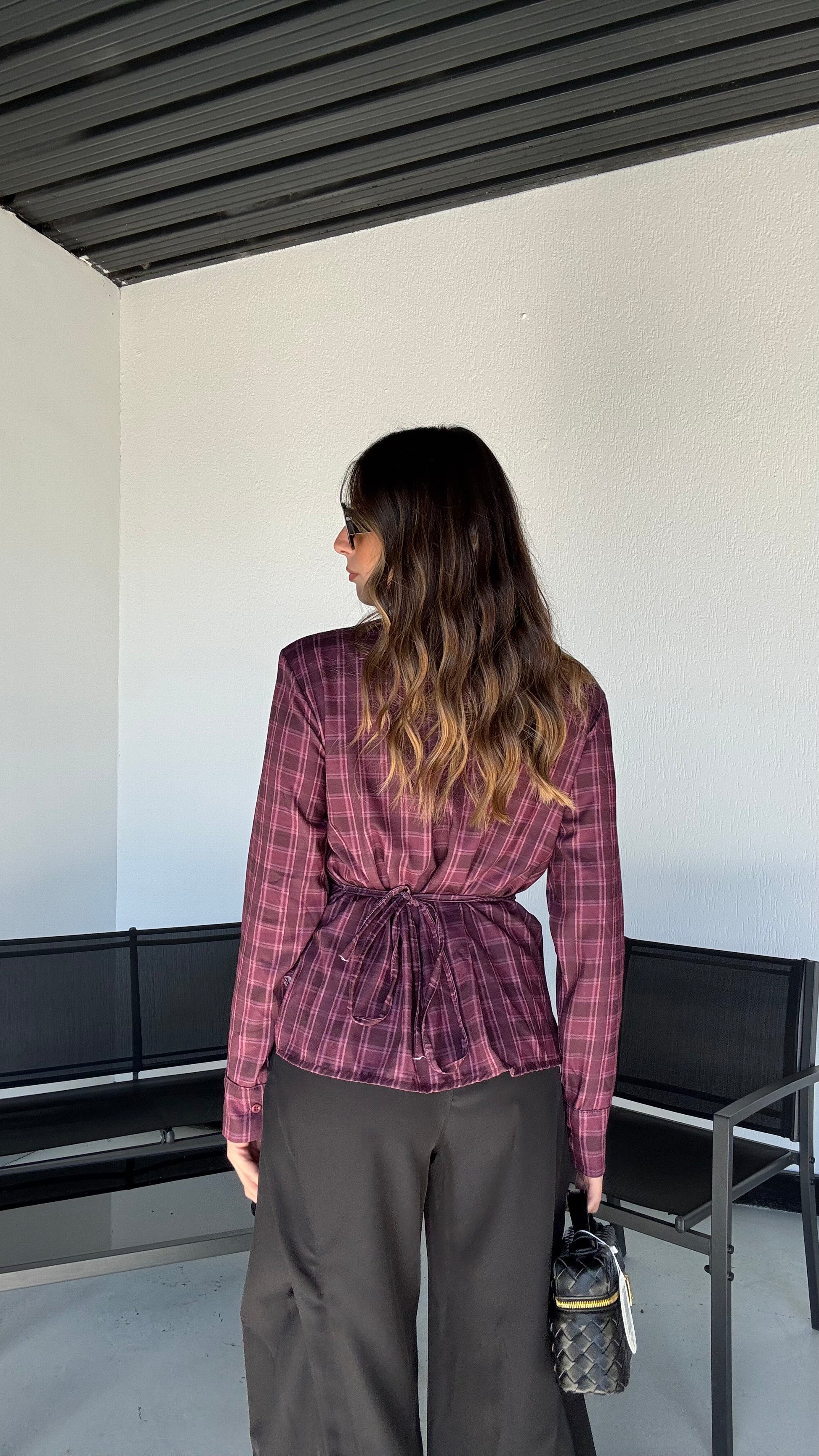 Camicia strutturata e particolare sfondo marrone e nocciola, spallina strutturata e imbottita, allaccio sul retro per regolare il punto vita, taglio vivo e asimmetrico sul fondo, taglia unica che veste 34-44.