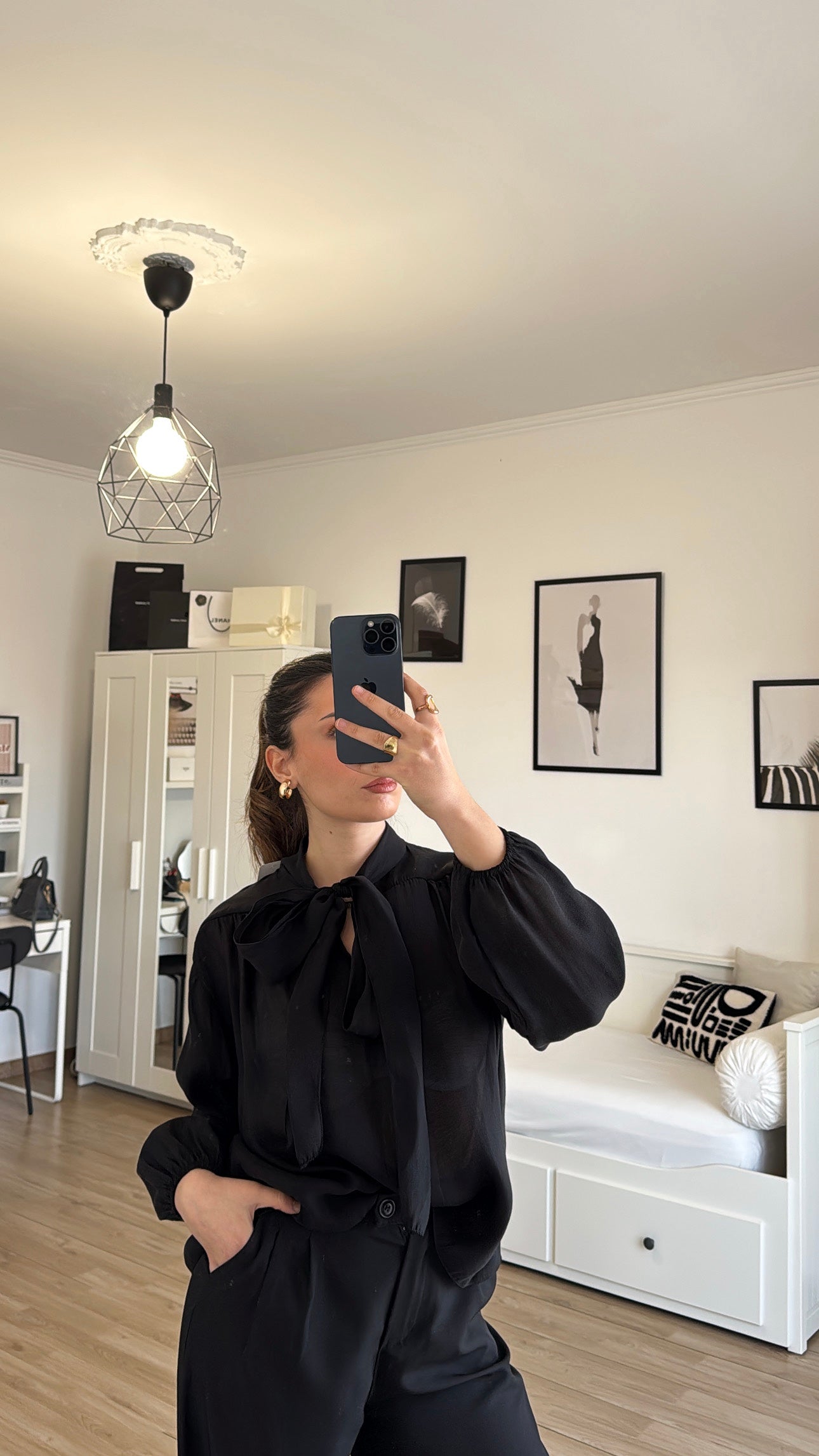 Camicia velata tg unica veste 34/46, tessuto fresco, fiocco al collo regolabile.
