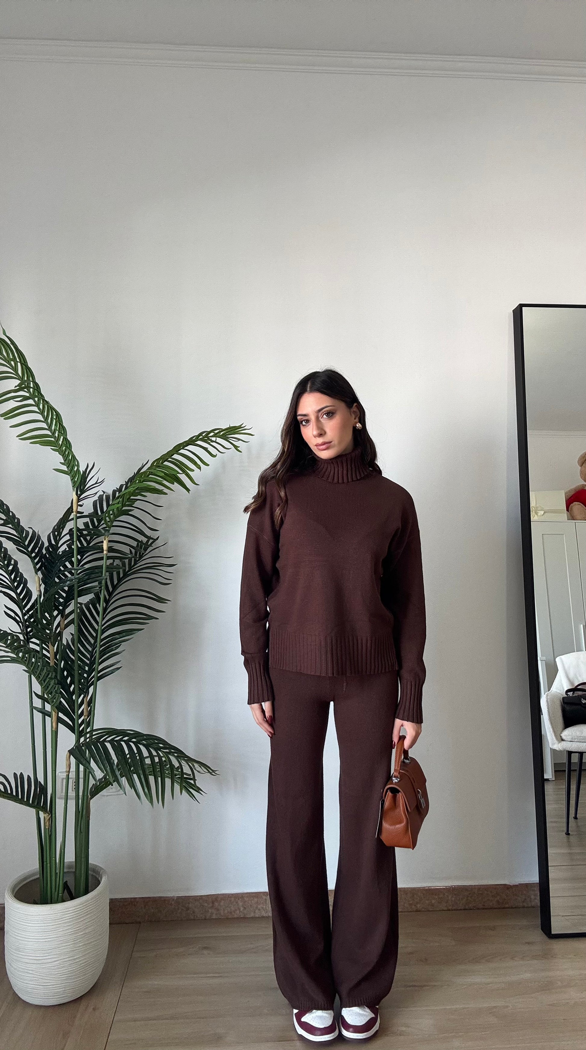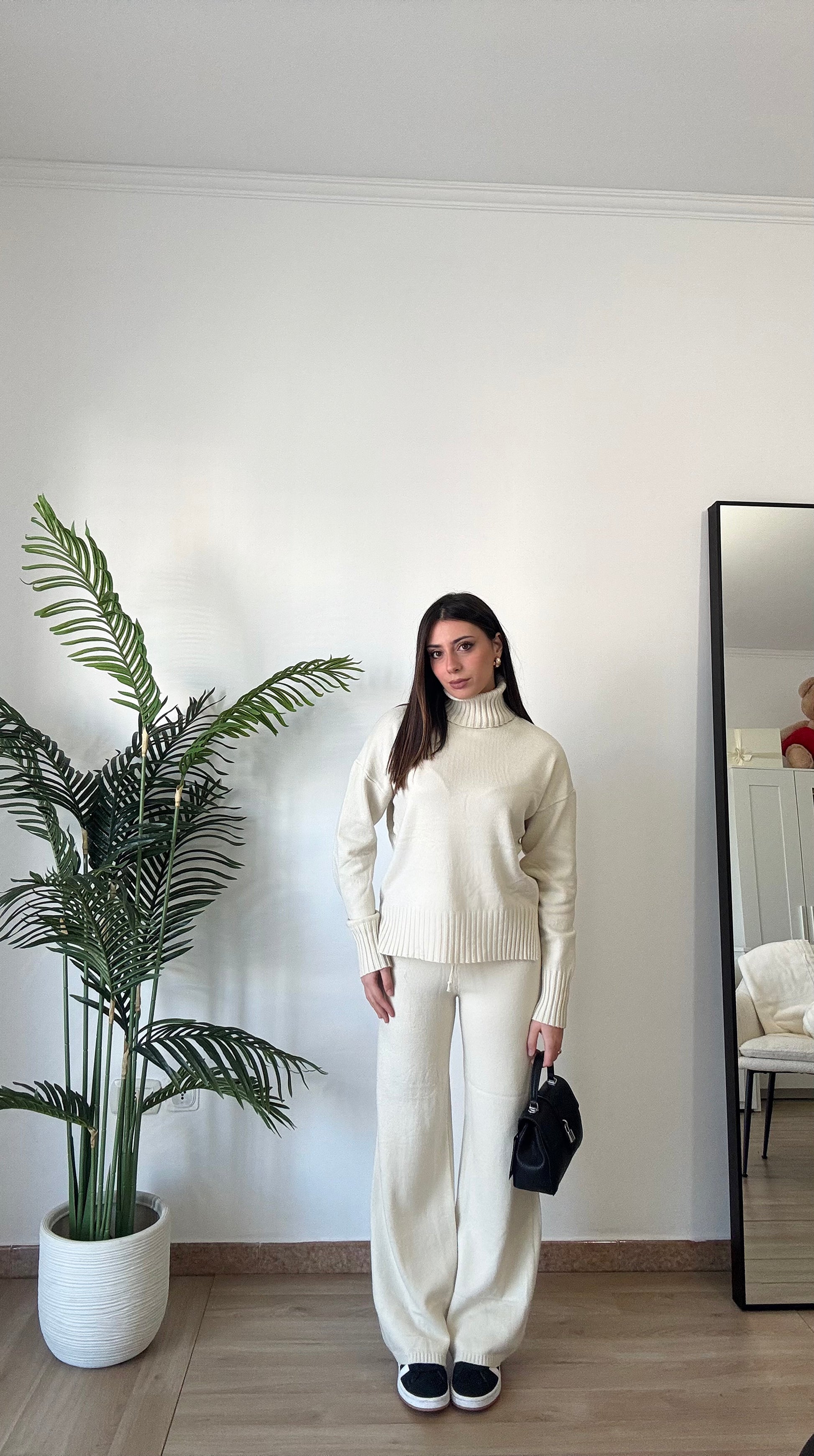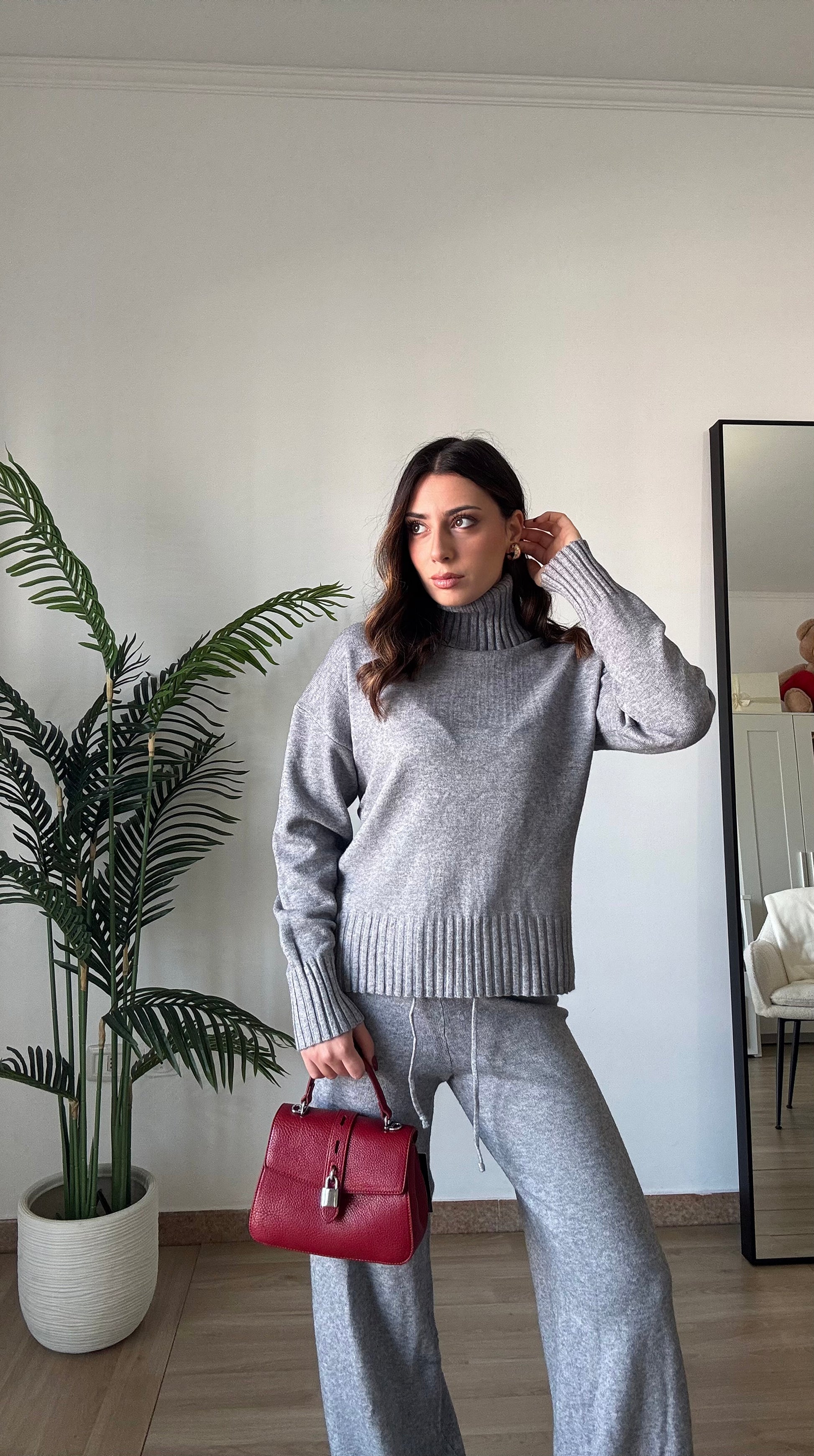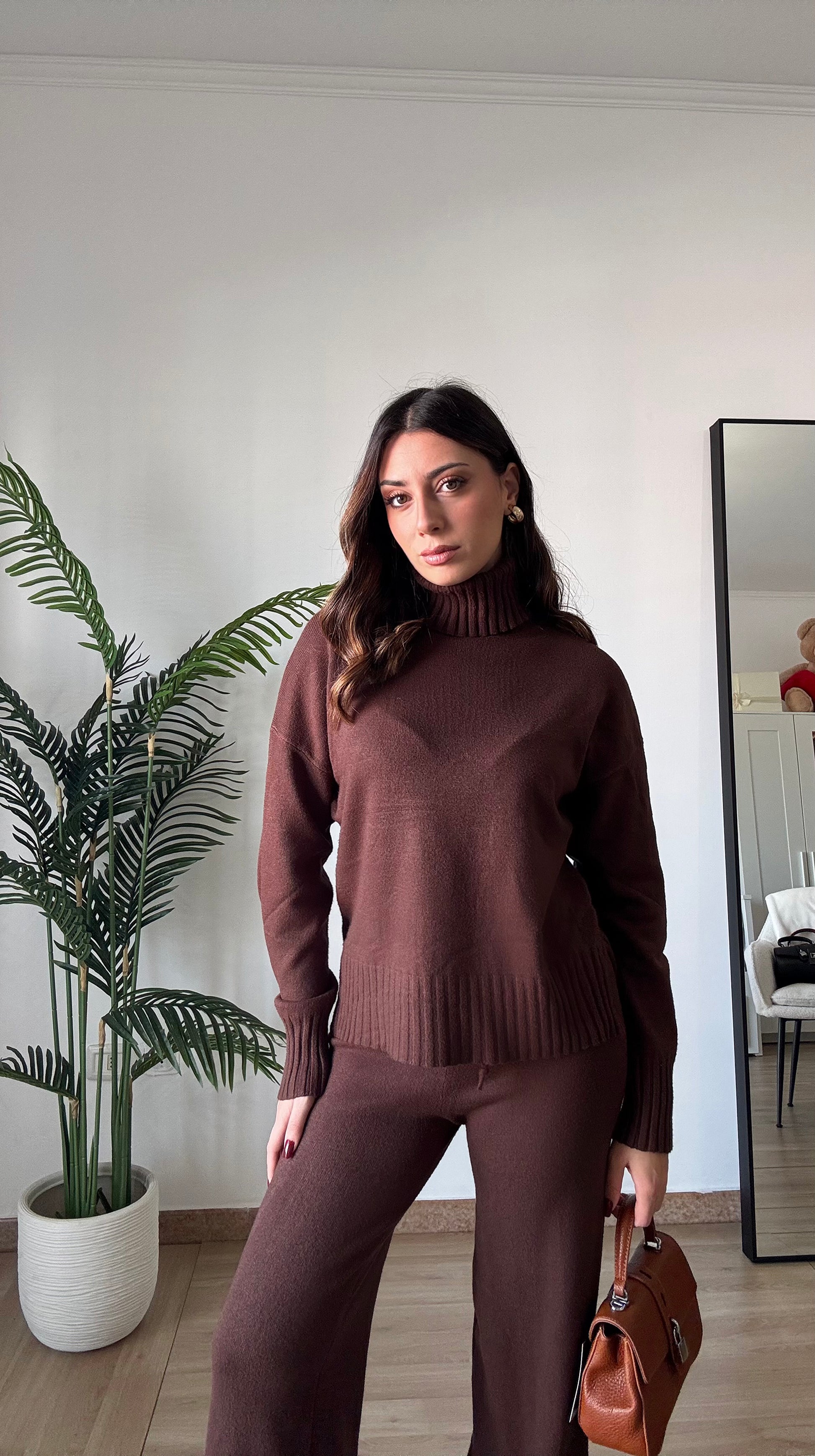 Coordinato in maglia super morbido e caldo, composto da pullover a collo alto e pant con elastico in vita super morbido, taglia unica veste 34-46.