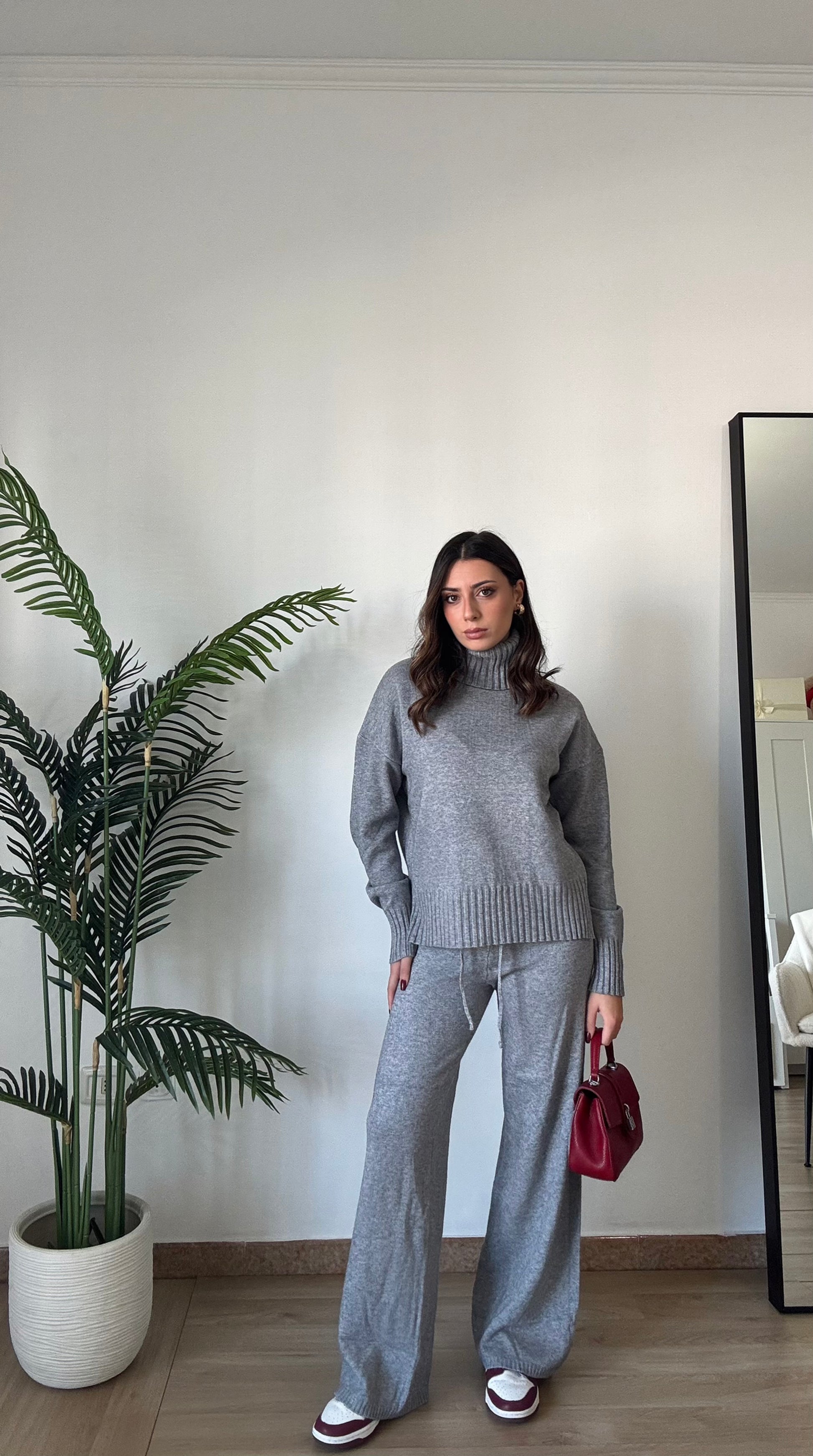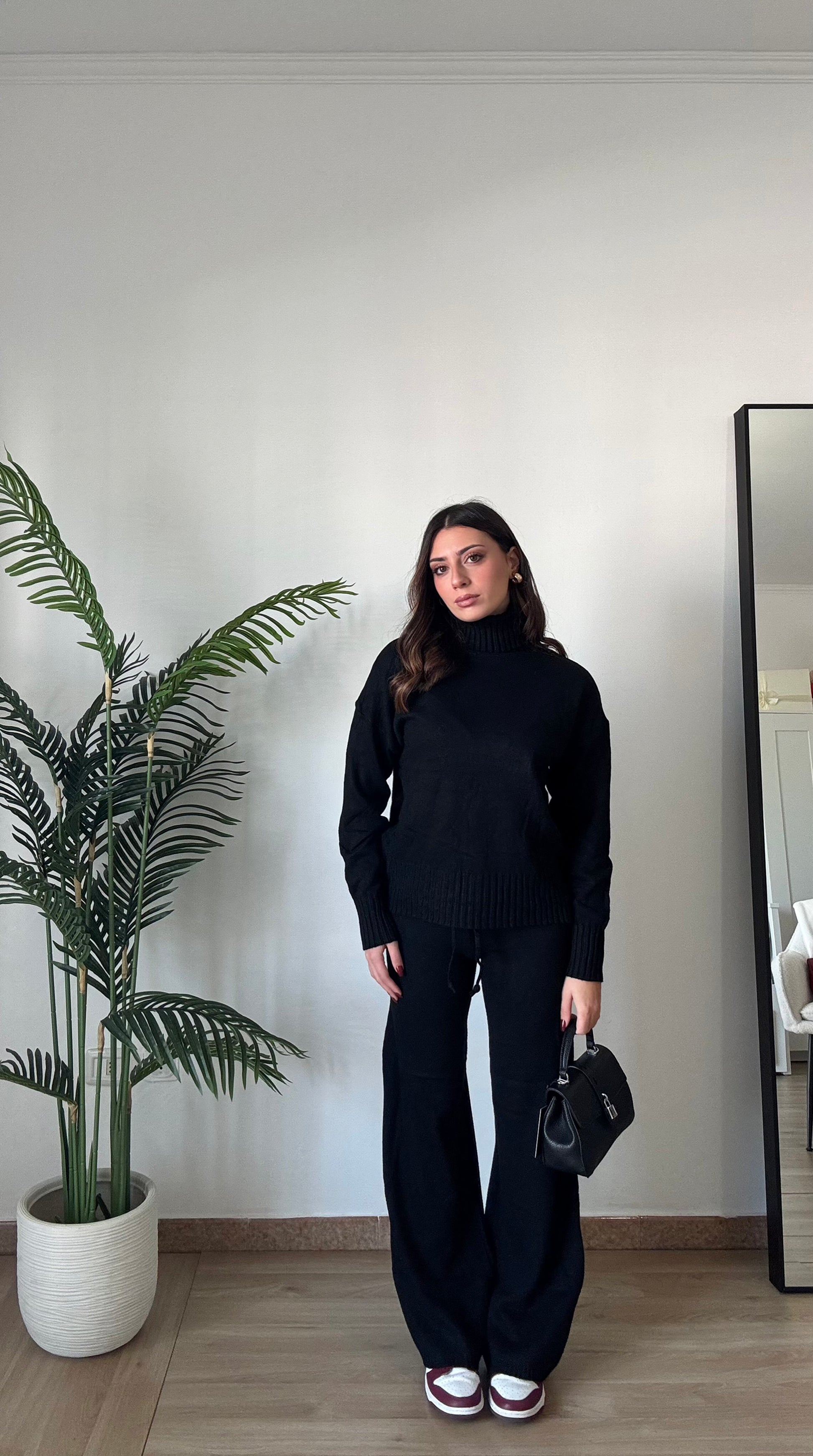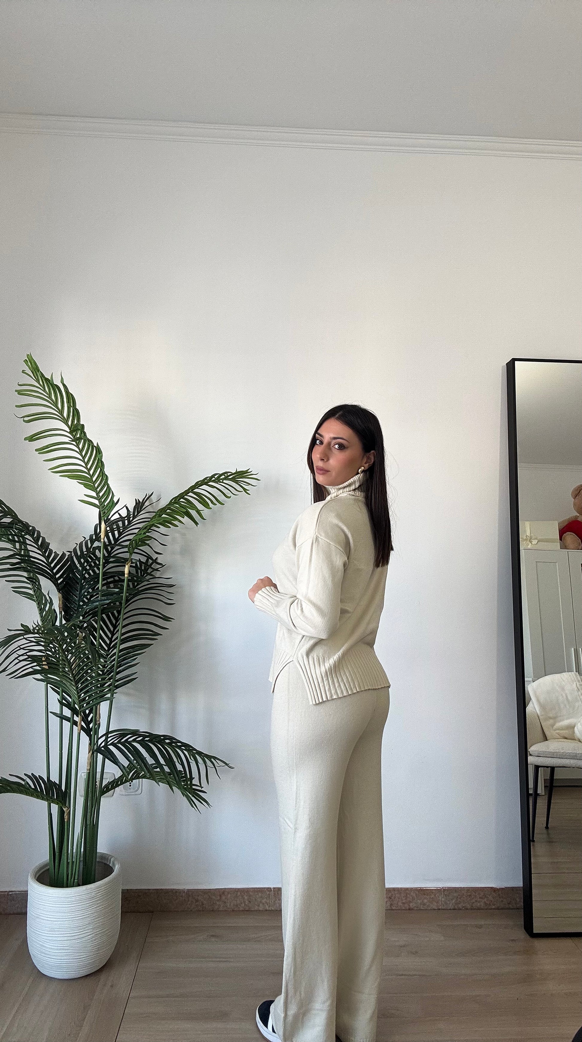 Coordinato in maglia super morbido e caldo, composto da pullover a collo alto e pant con elastico in vita super morbido, taglia unica veste 34-46.