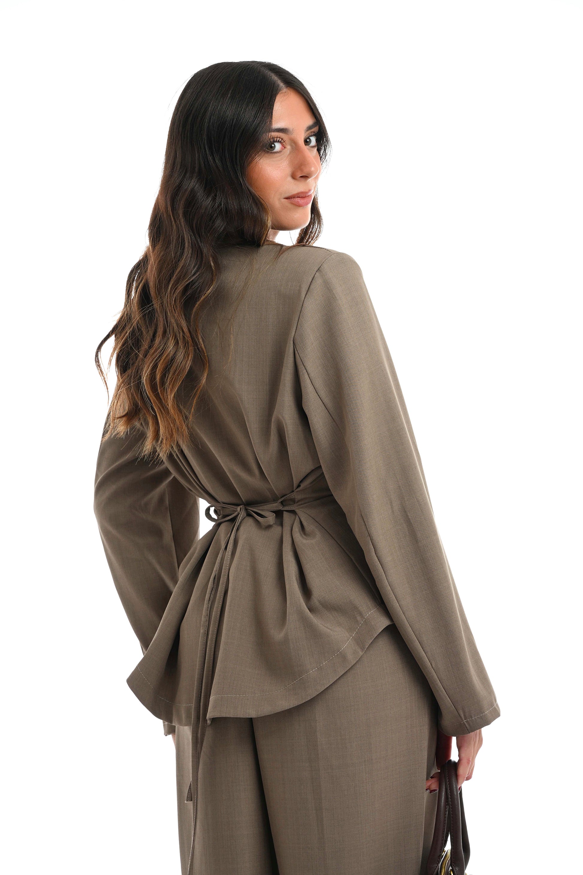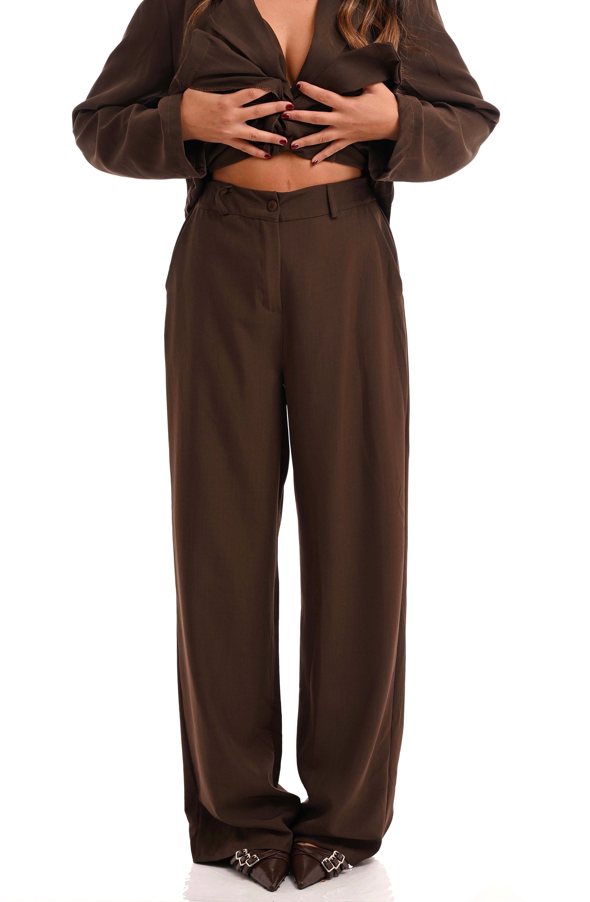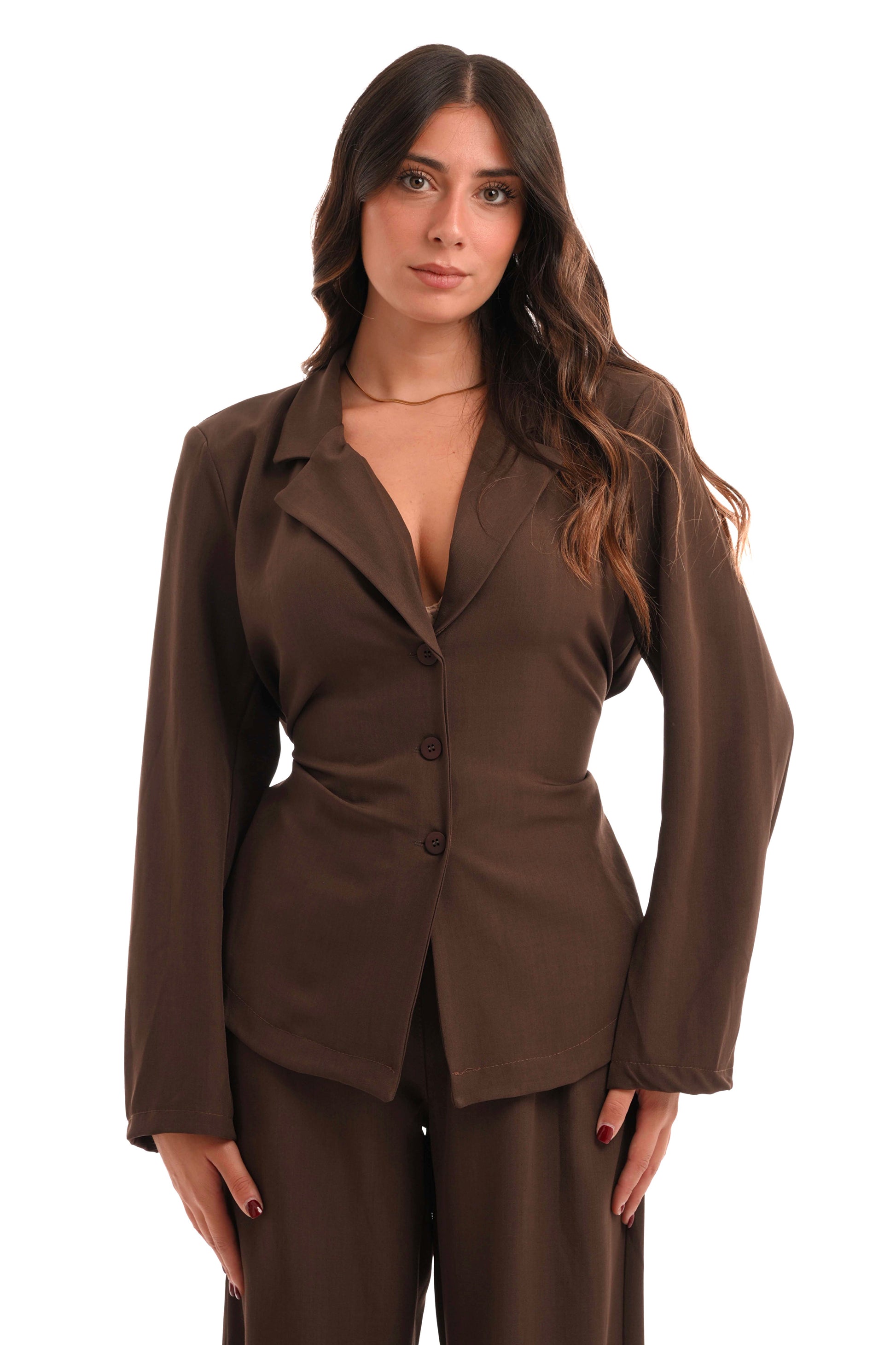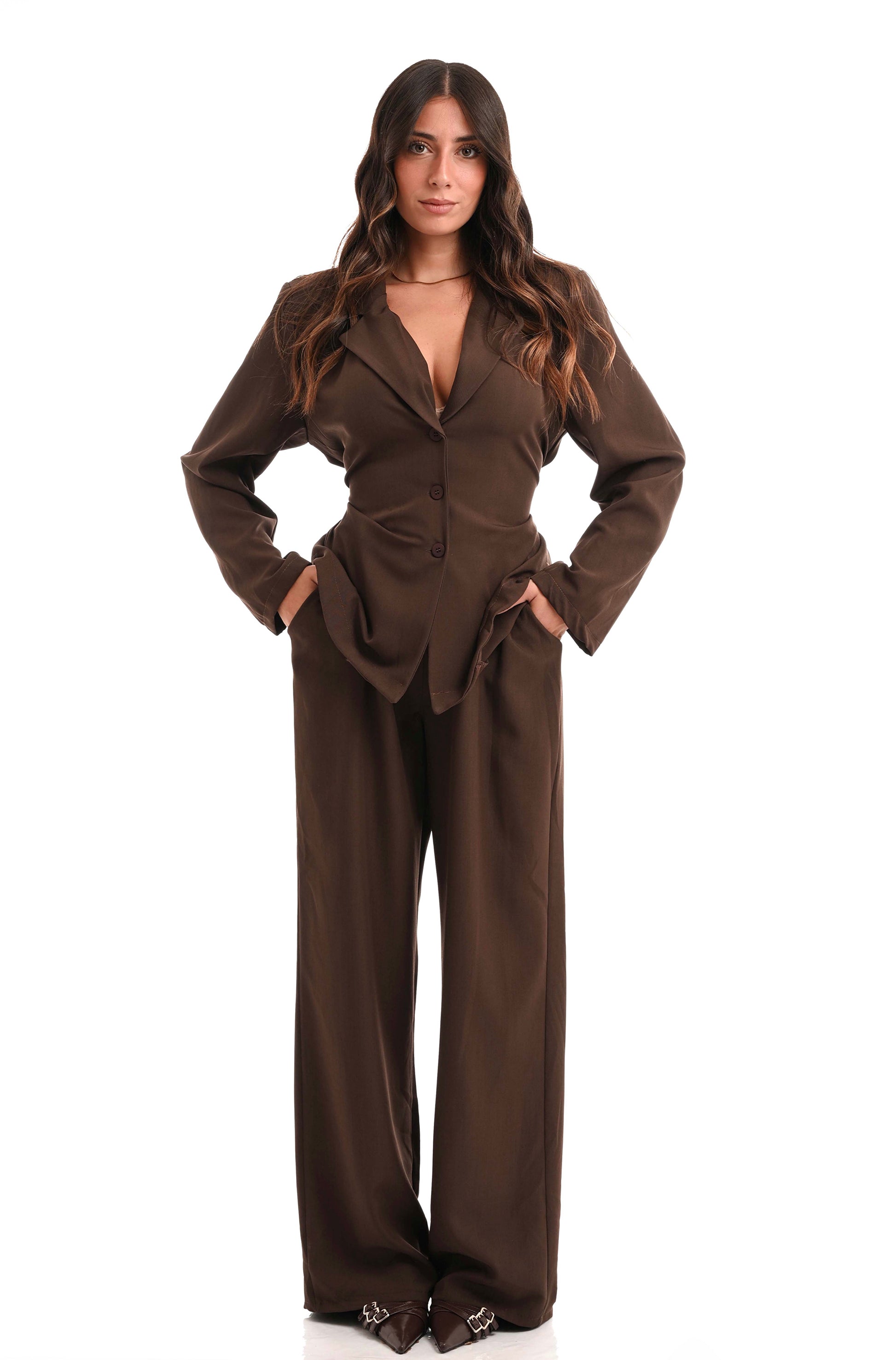 Coord set Amelie composto dalla sua giacca/camicia con spalle imbottite e bottoncini centrali, allaccio sul retro per stringere il punto vita, pantalone che scende morbido al tatto non segna ed ha un’ottima vestibilità, con elastico sul retro taglia unica che veste 38-46.