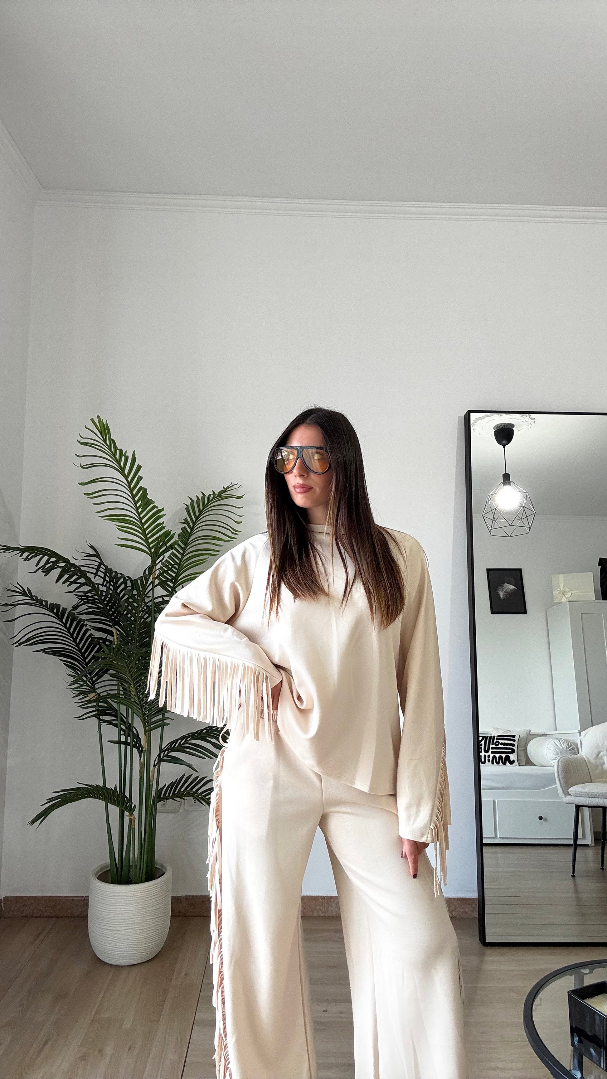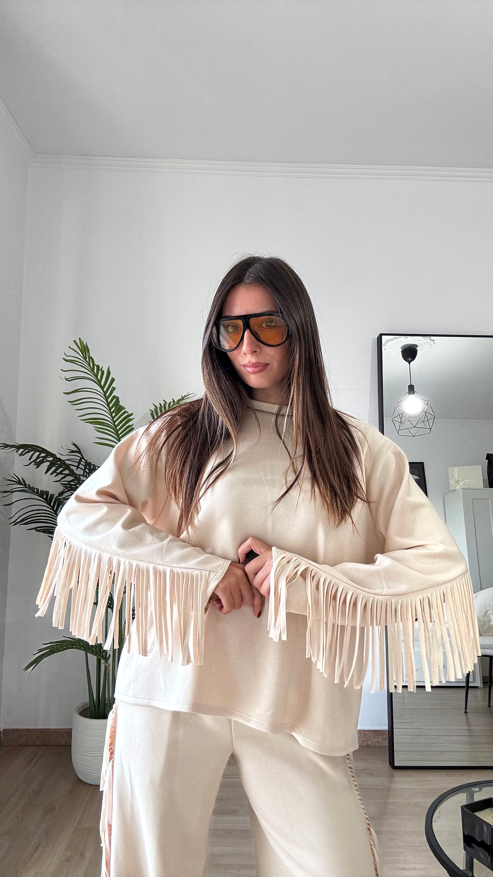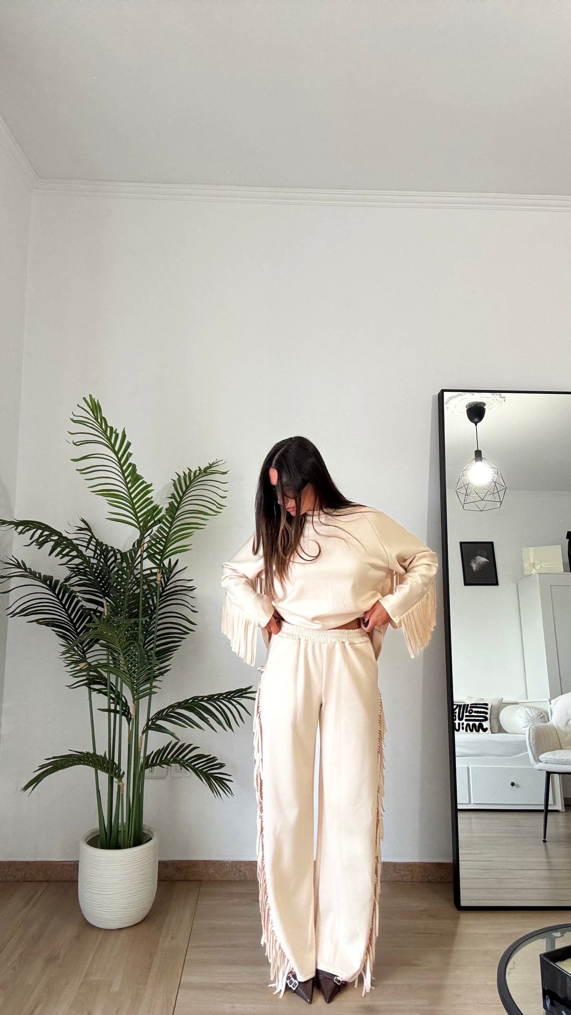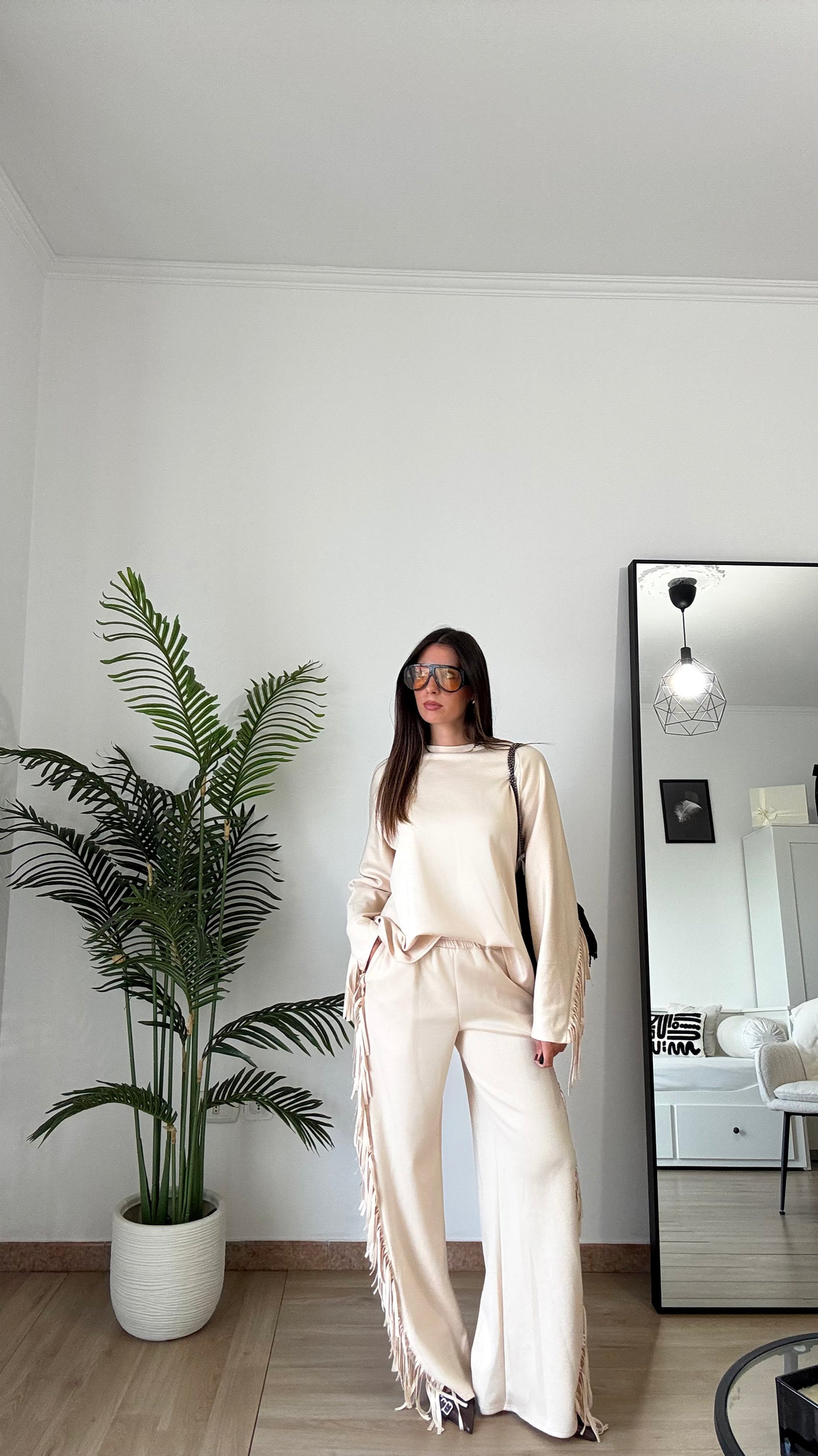 Coord set con frange in un’ottima qualità tessuto in viscosa, felpa e pantalone super particolari, sono taglia unica che vestono 36-48, pant con elastico in vita super morbido, versatile comodo e con stile!