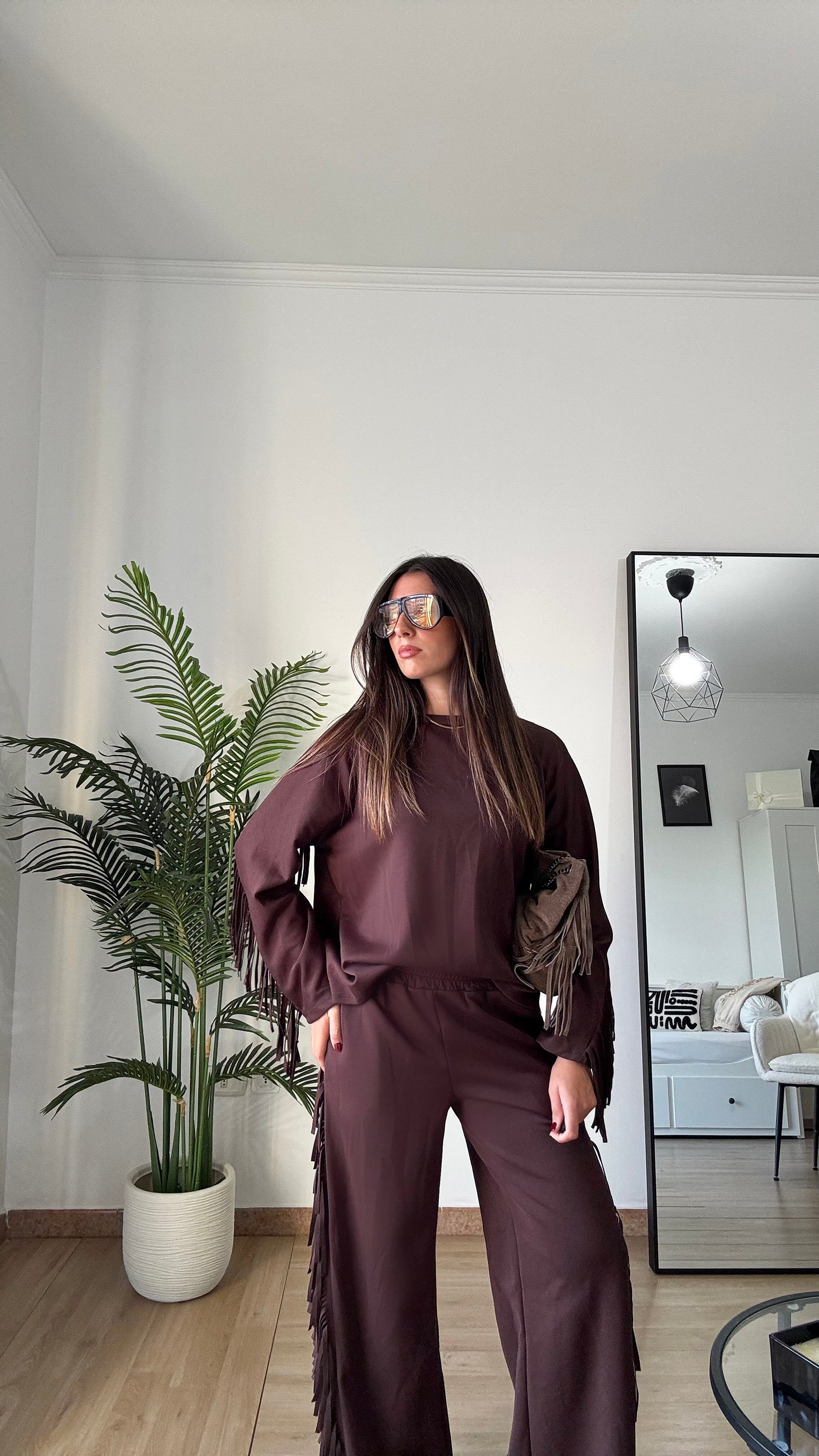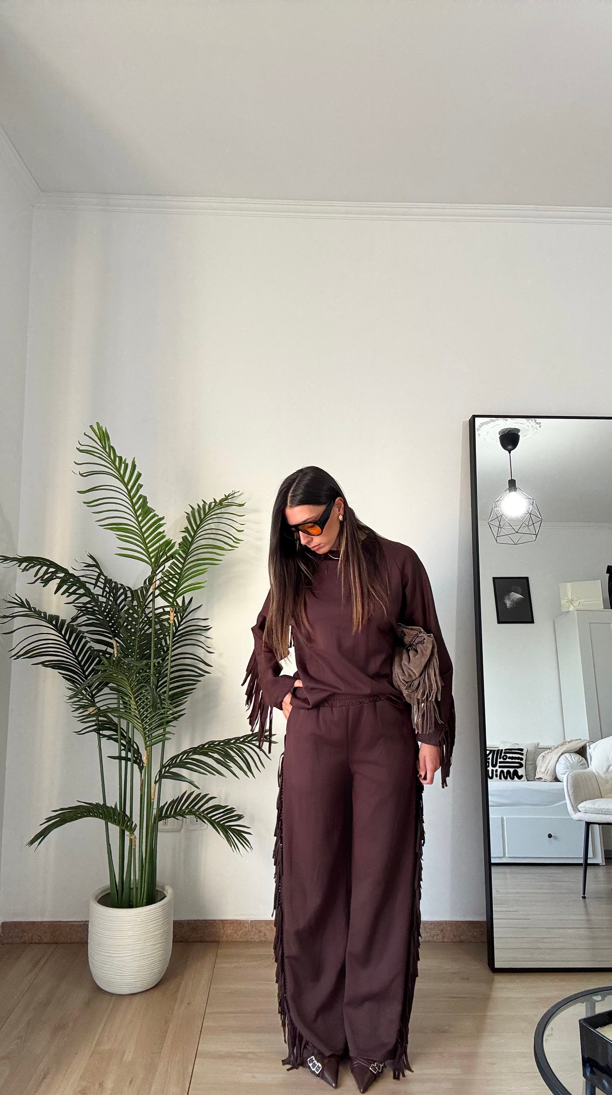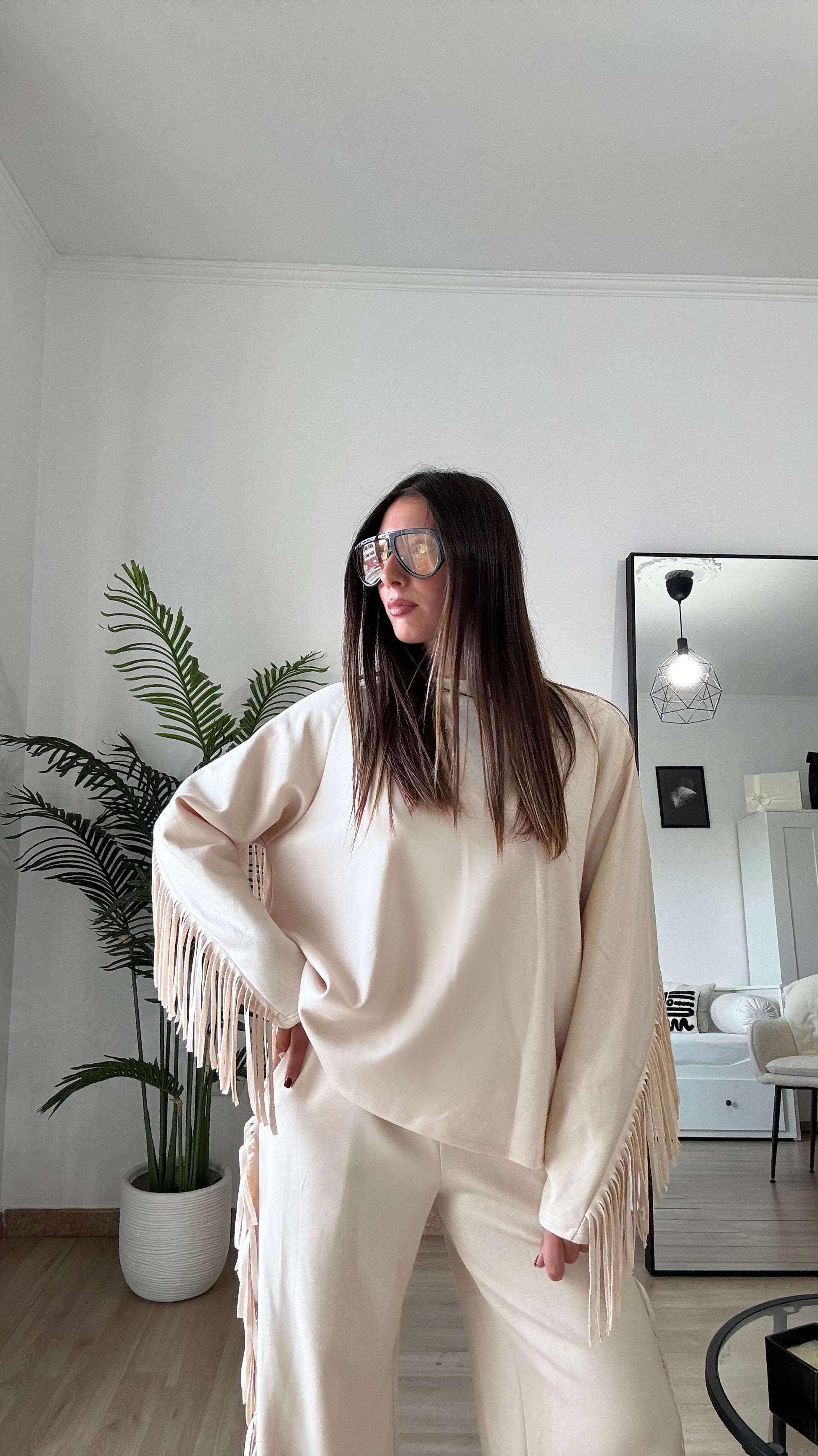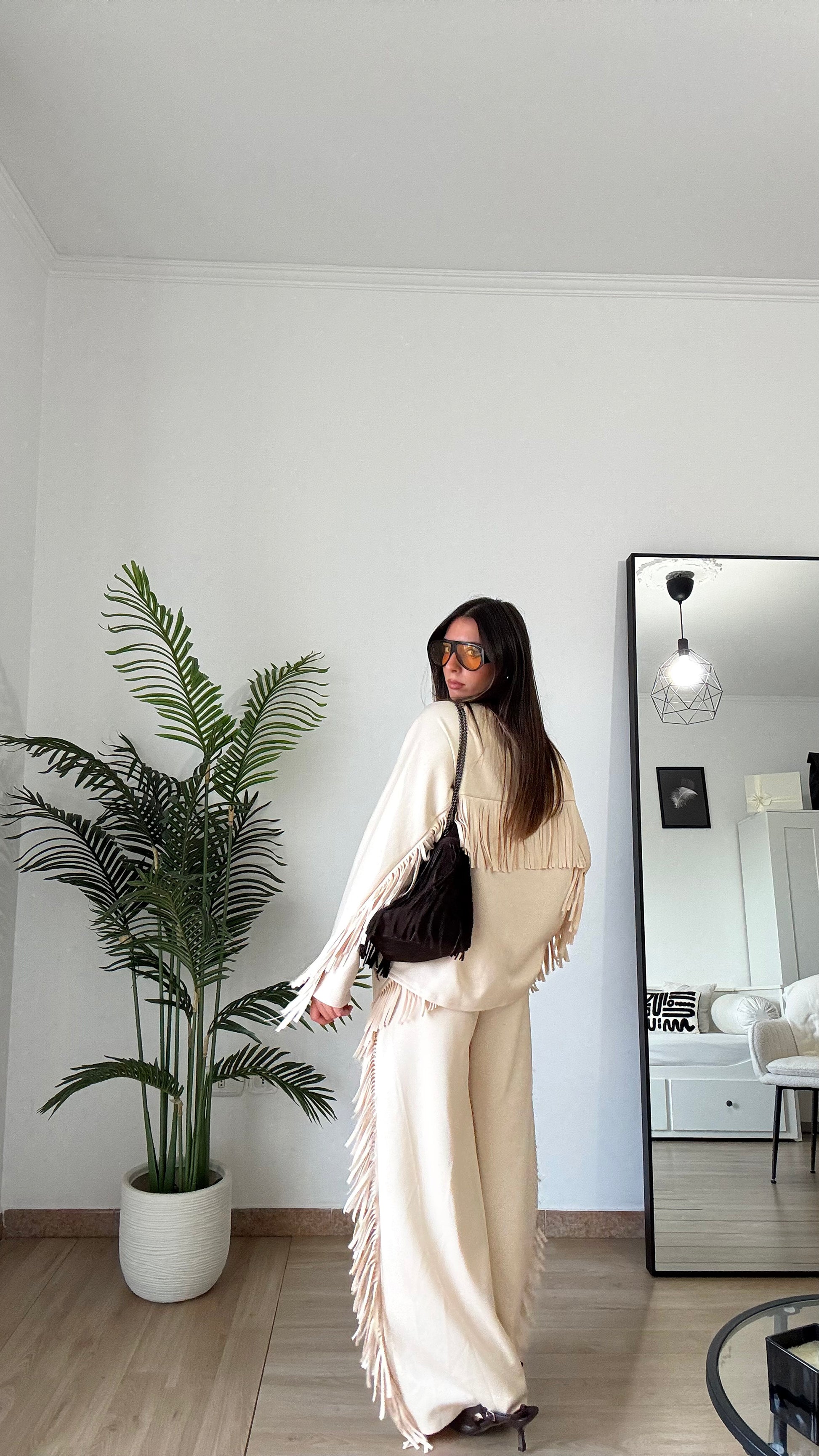 Coord set con frange in un’ottima qualità tessuto in viscosa, felpa e pantalone super particolari, sono taglia unica che vestono 36-48, pant con elastico in vita super morbido, versatile comodo e con stile!