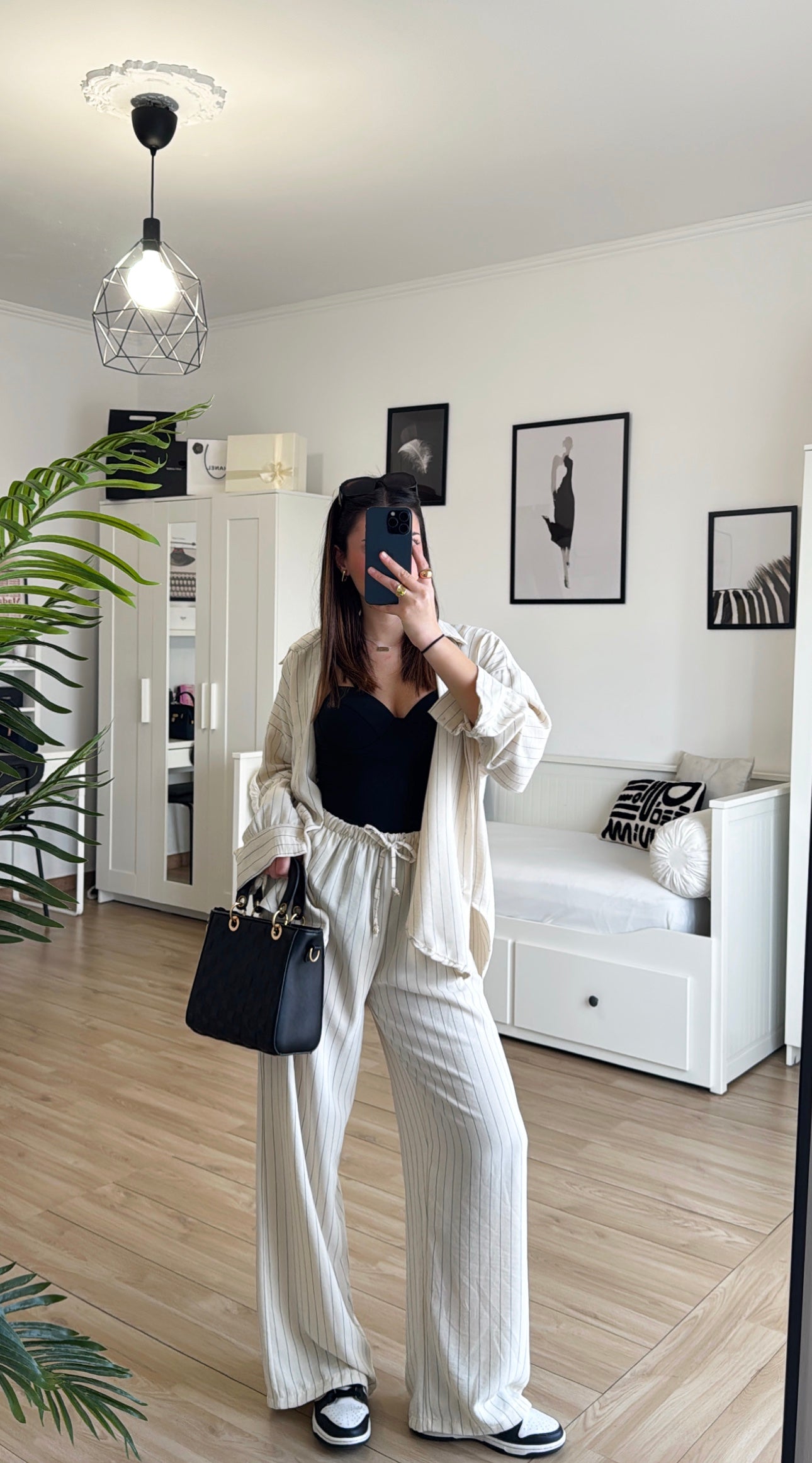 Coordinato Gessato composto da camicia e pantatuta con elastico in vita regolabile, tessuto velato, taglia unica che veste S-L.