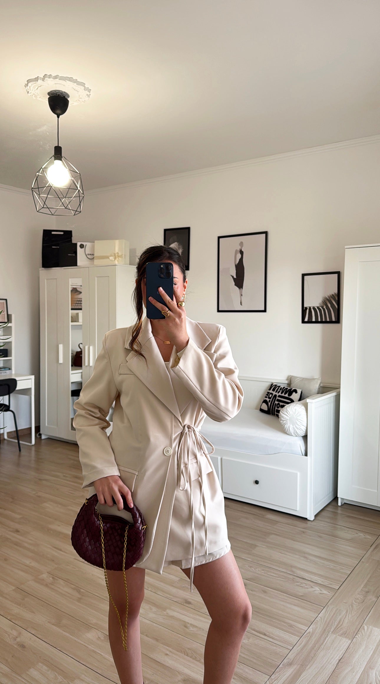 Coordinato composto da: Maxi Blazer over con spalle imbottite e fiocco sul lato destro regolabile, e gonna a pantaloncino con fiocchetti e cerniera sul lato sinistro.