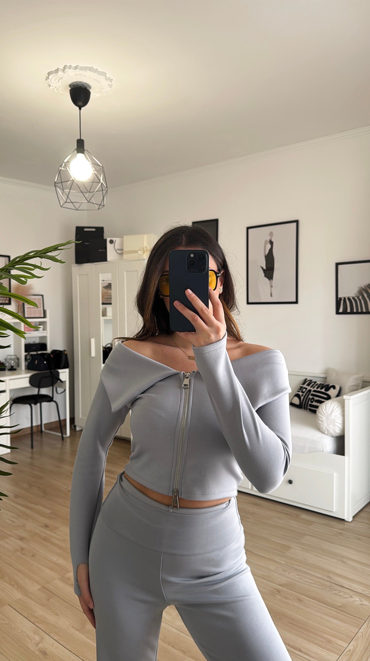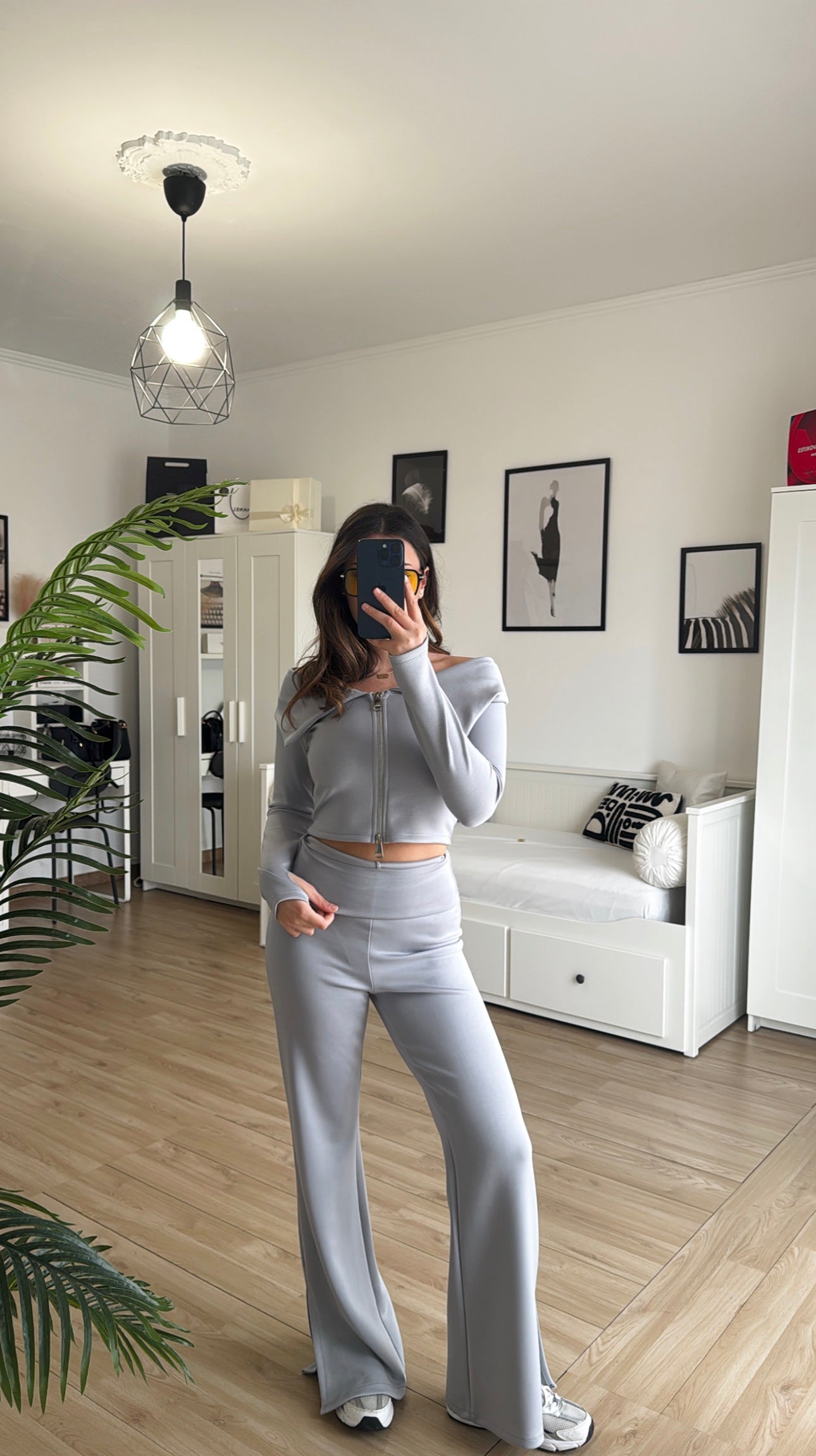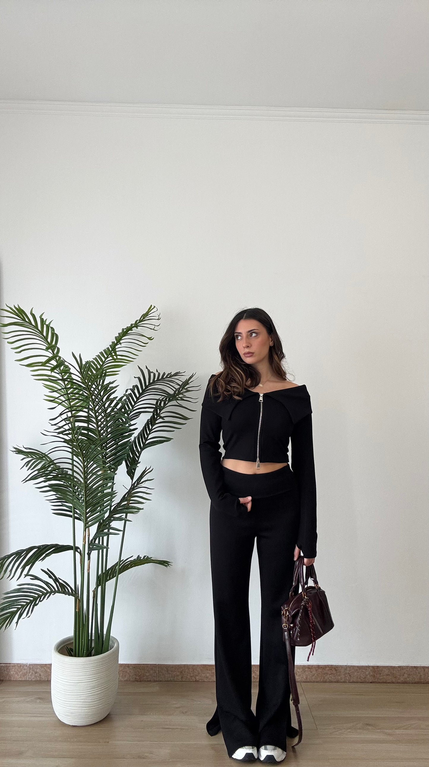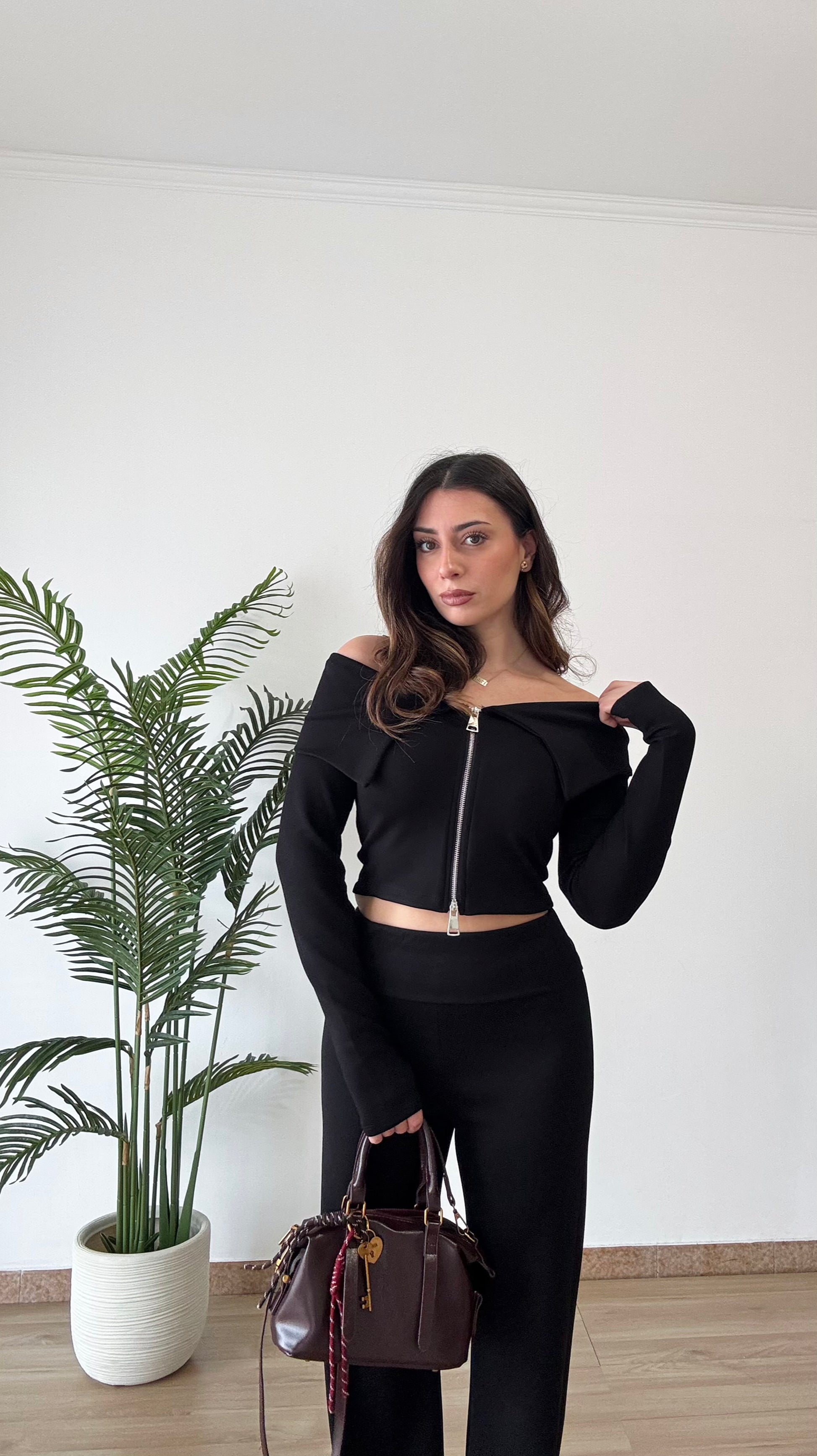 Coordinato in tuta felpetta con cerniera e spalle scoperte, panta tuta elasticizzato, veste 34/46.