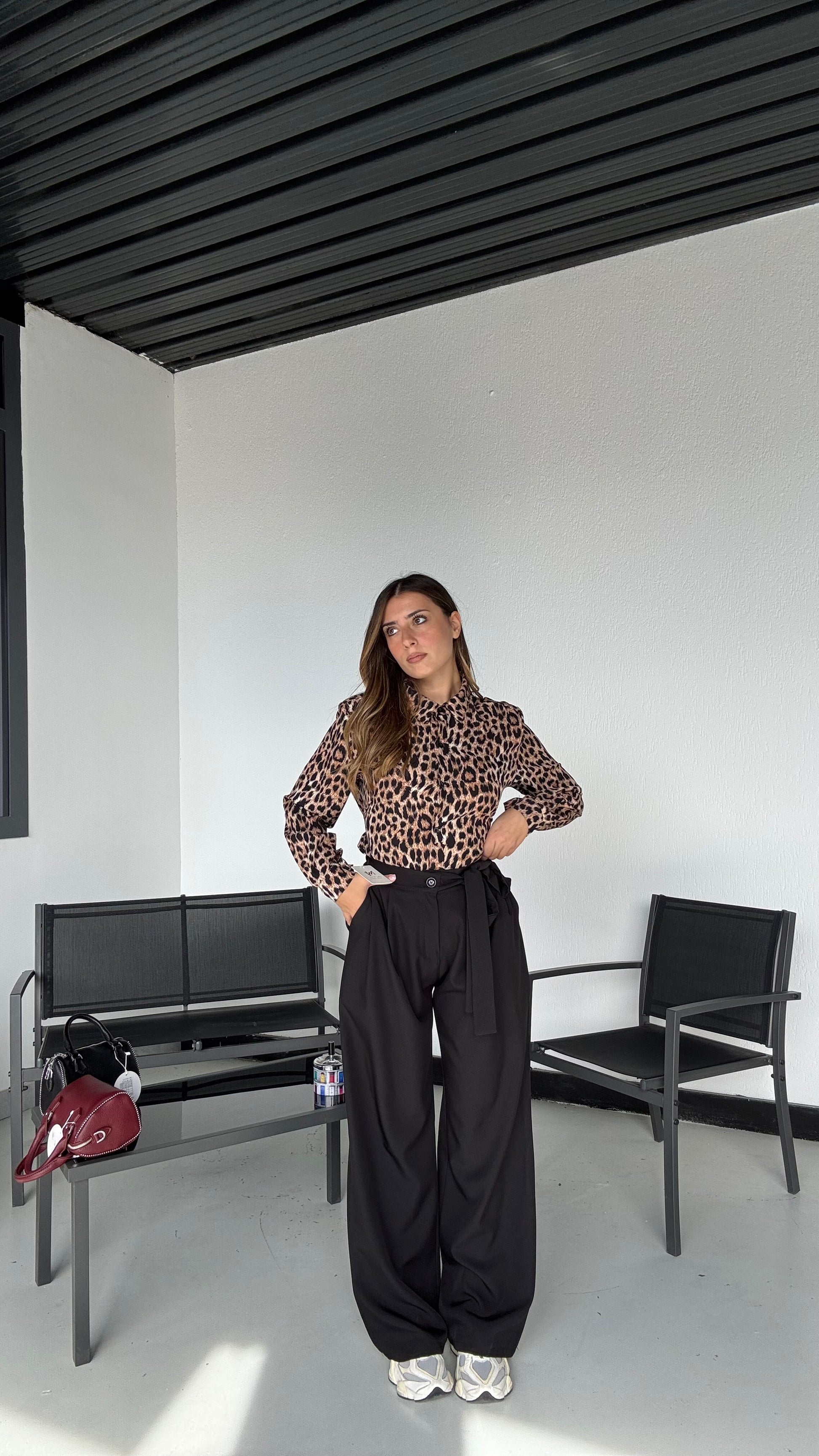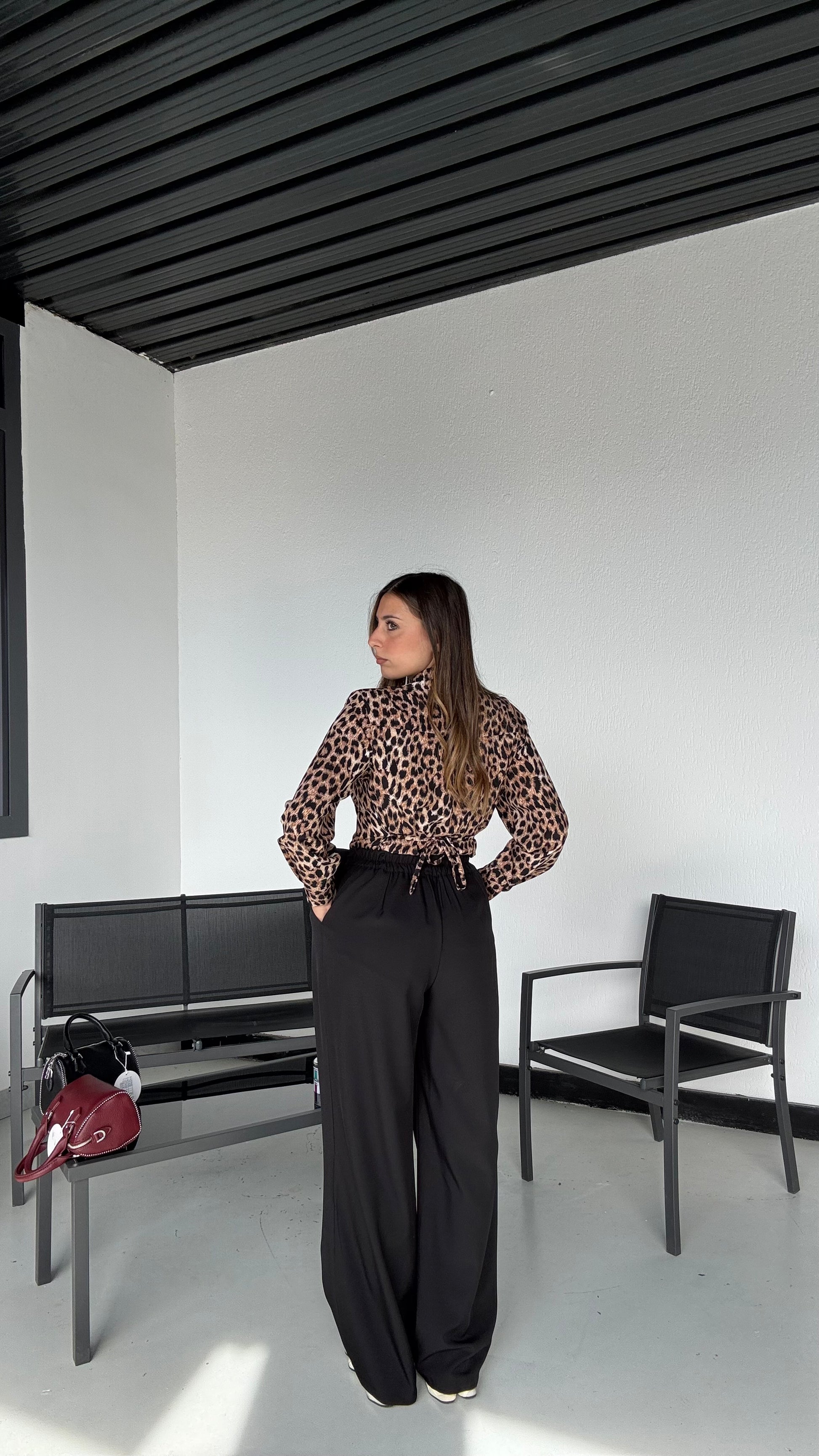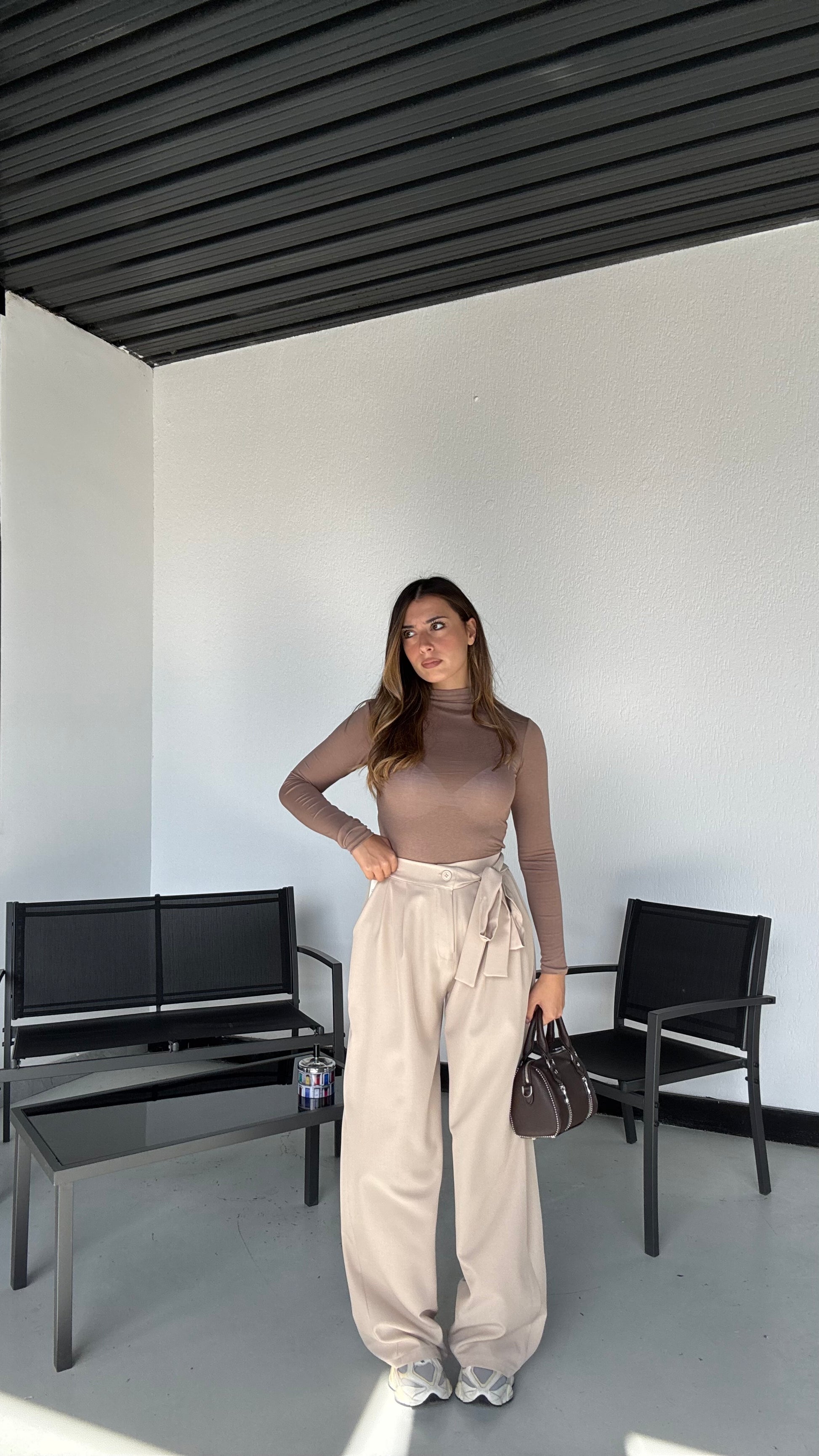 Pantalone alta vita con elastico sul retro e fiocco sul lato regolabile, taglia unica che veste 35-46, con tasche .
