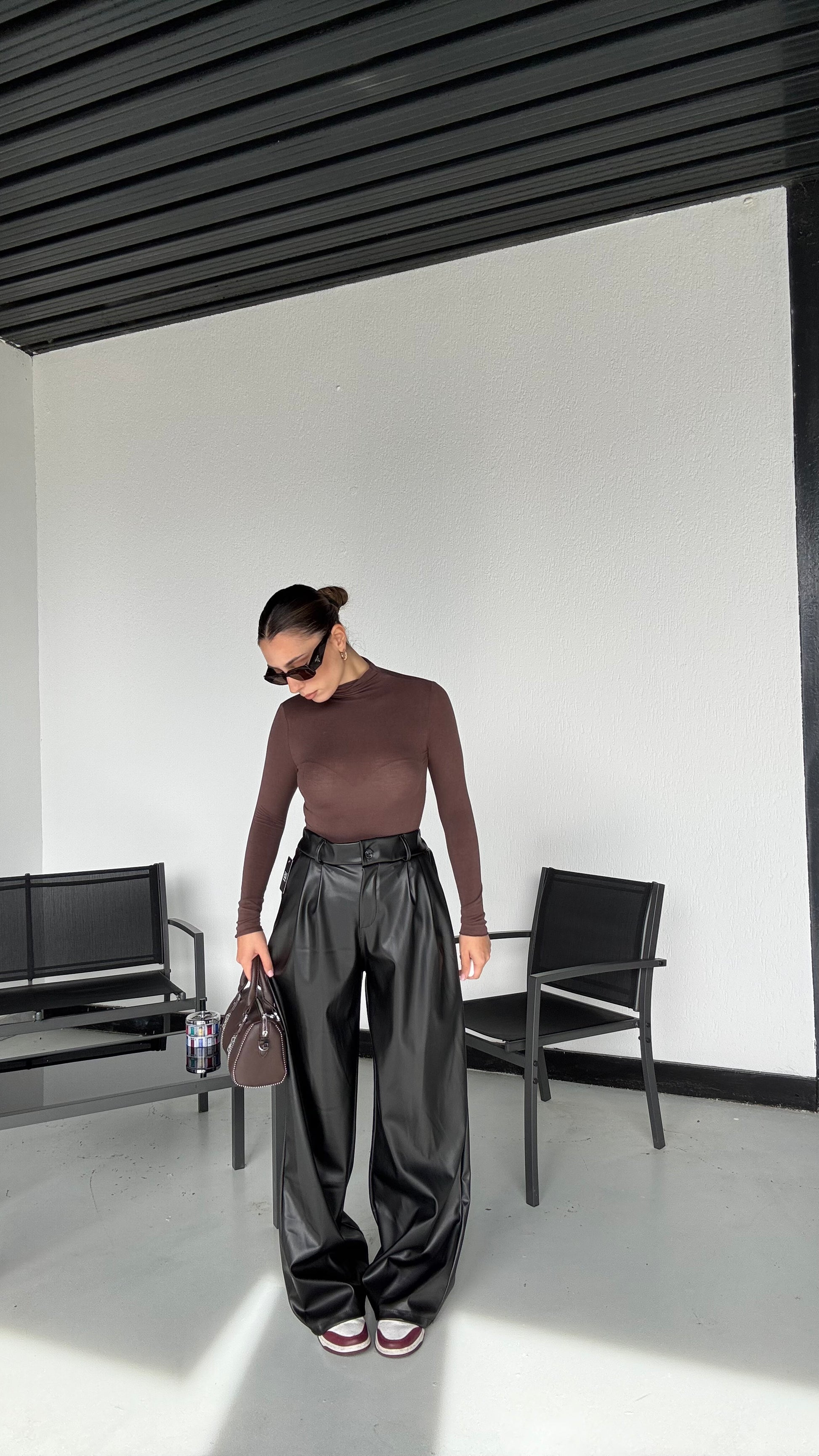 Pantalone in ecopelle interno felpato, con elastico sul retro taglia unica che veste 36-46 abbondante, con passati e tasche.