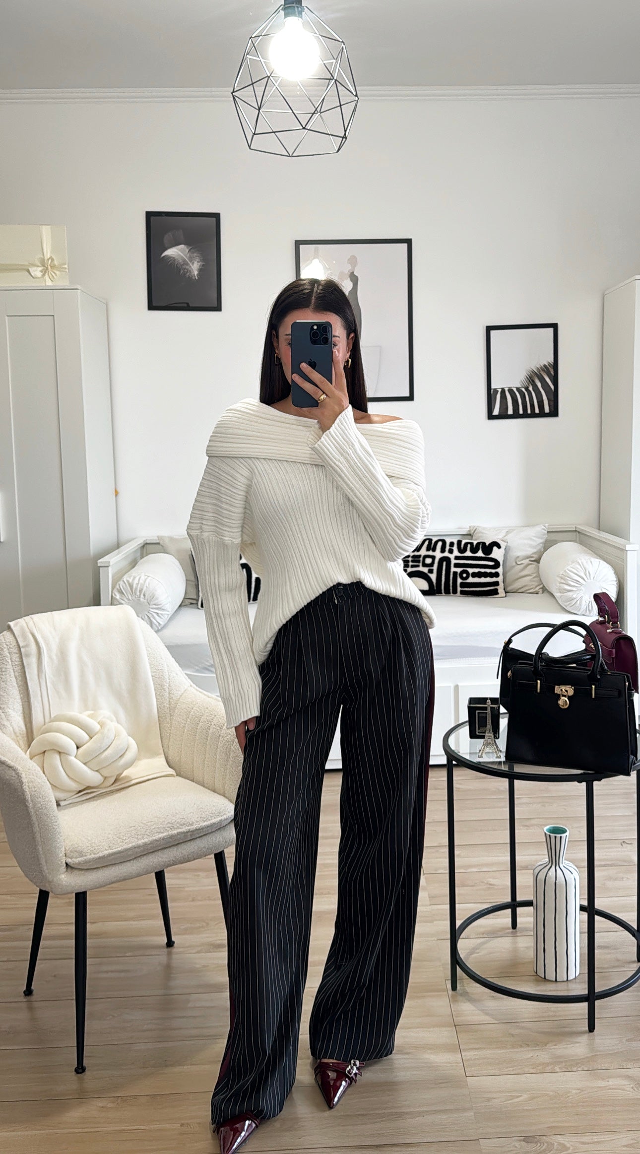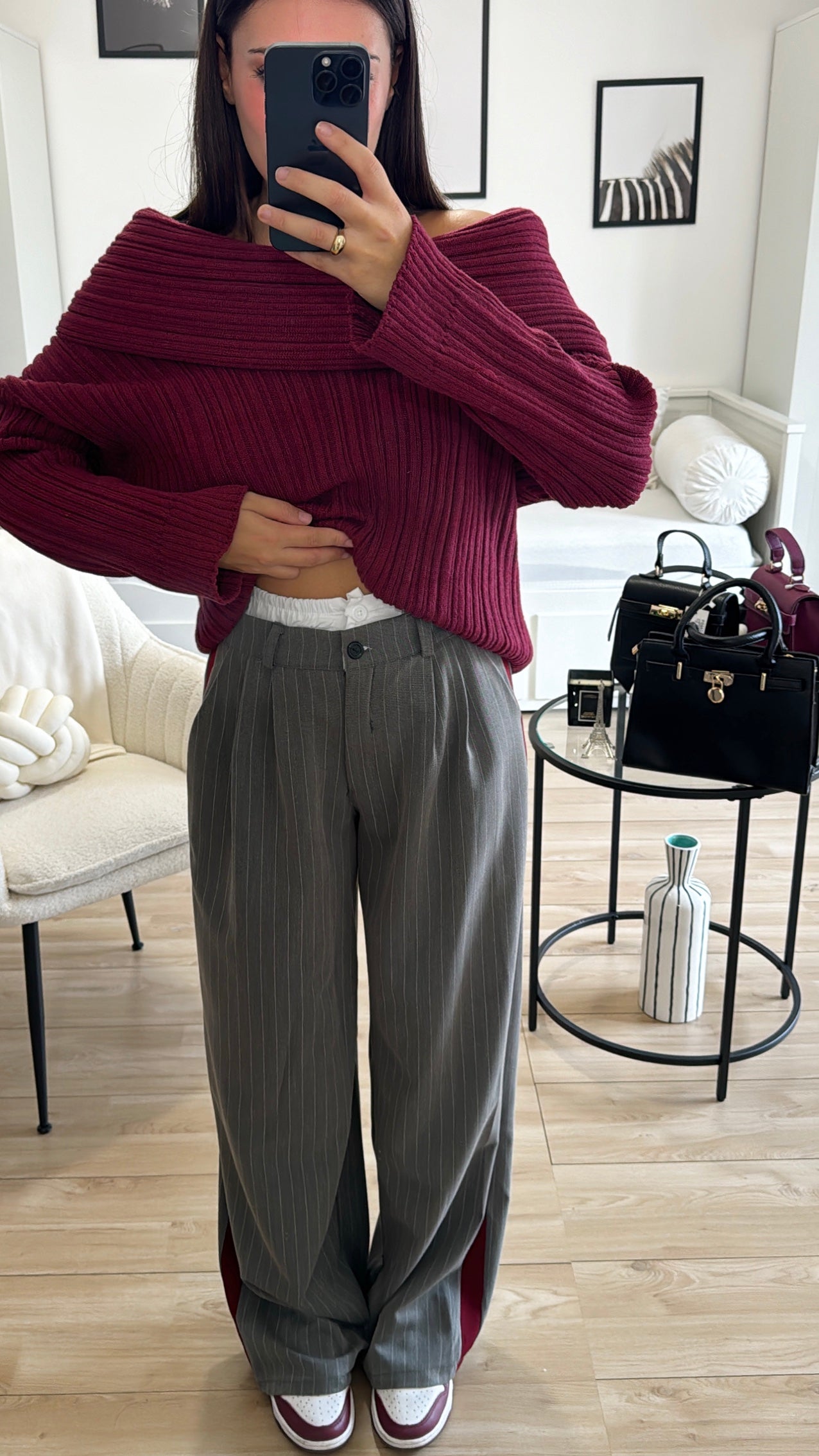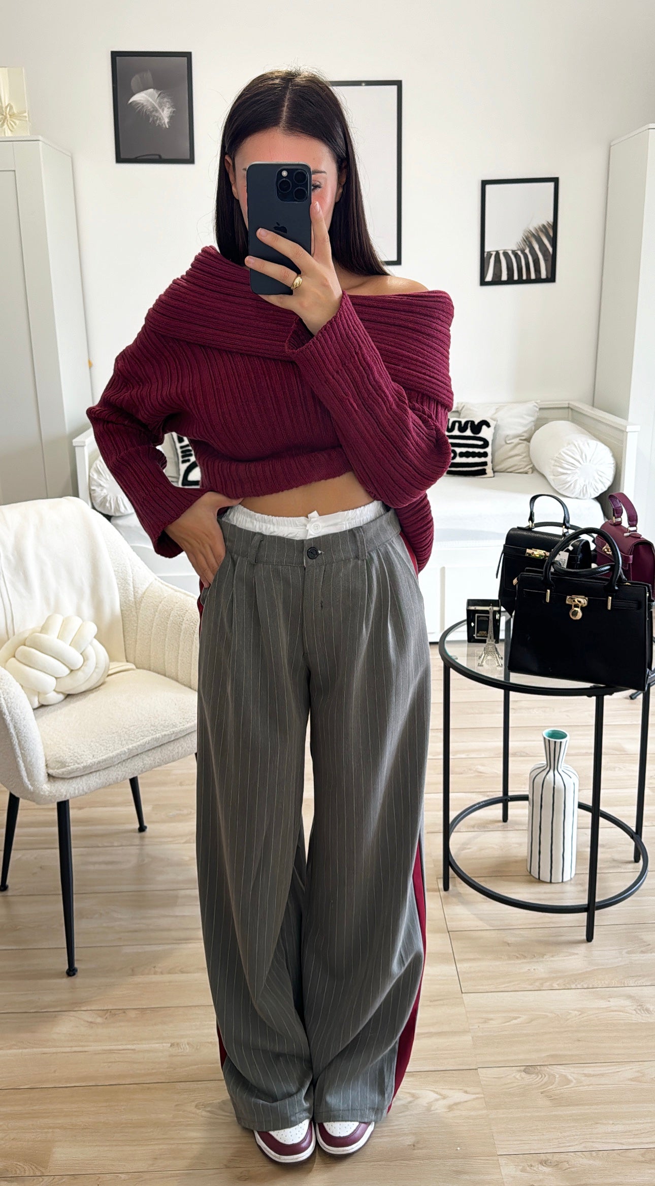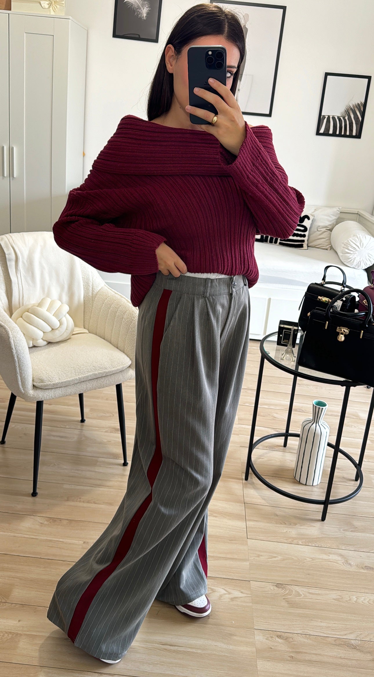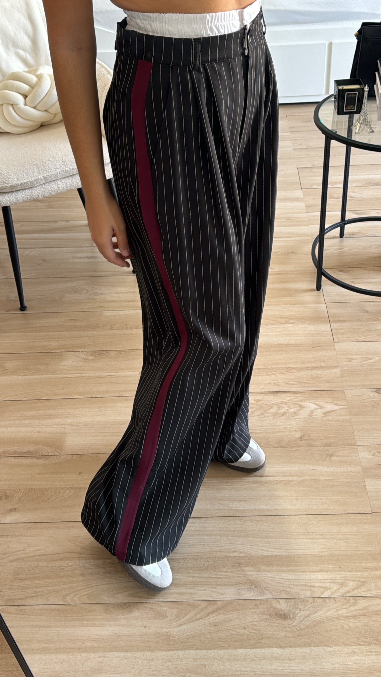 Pantalone gessato tg S-M-L doppia chiusura, linea bordeaux sui lati.