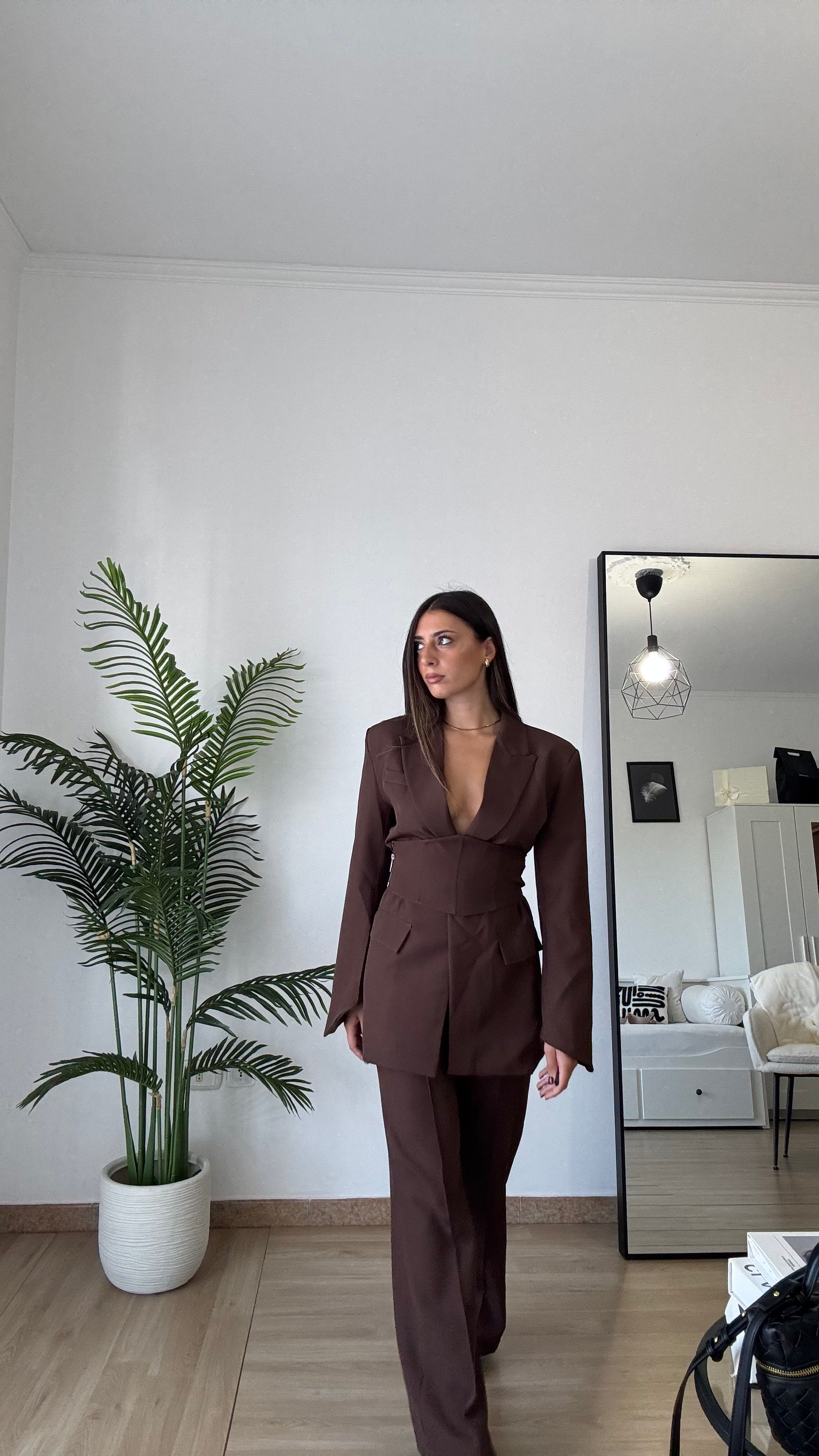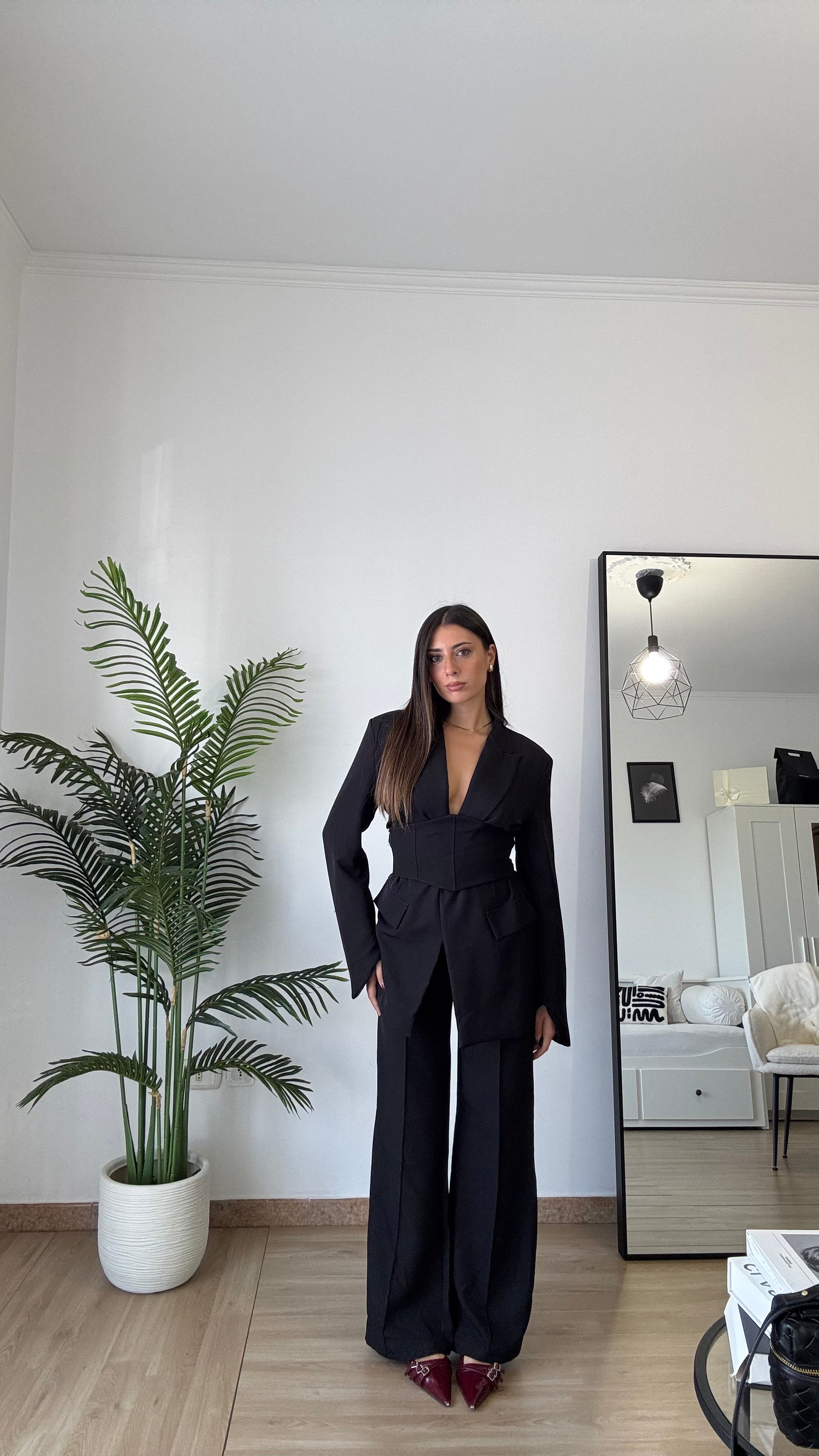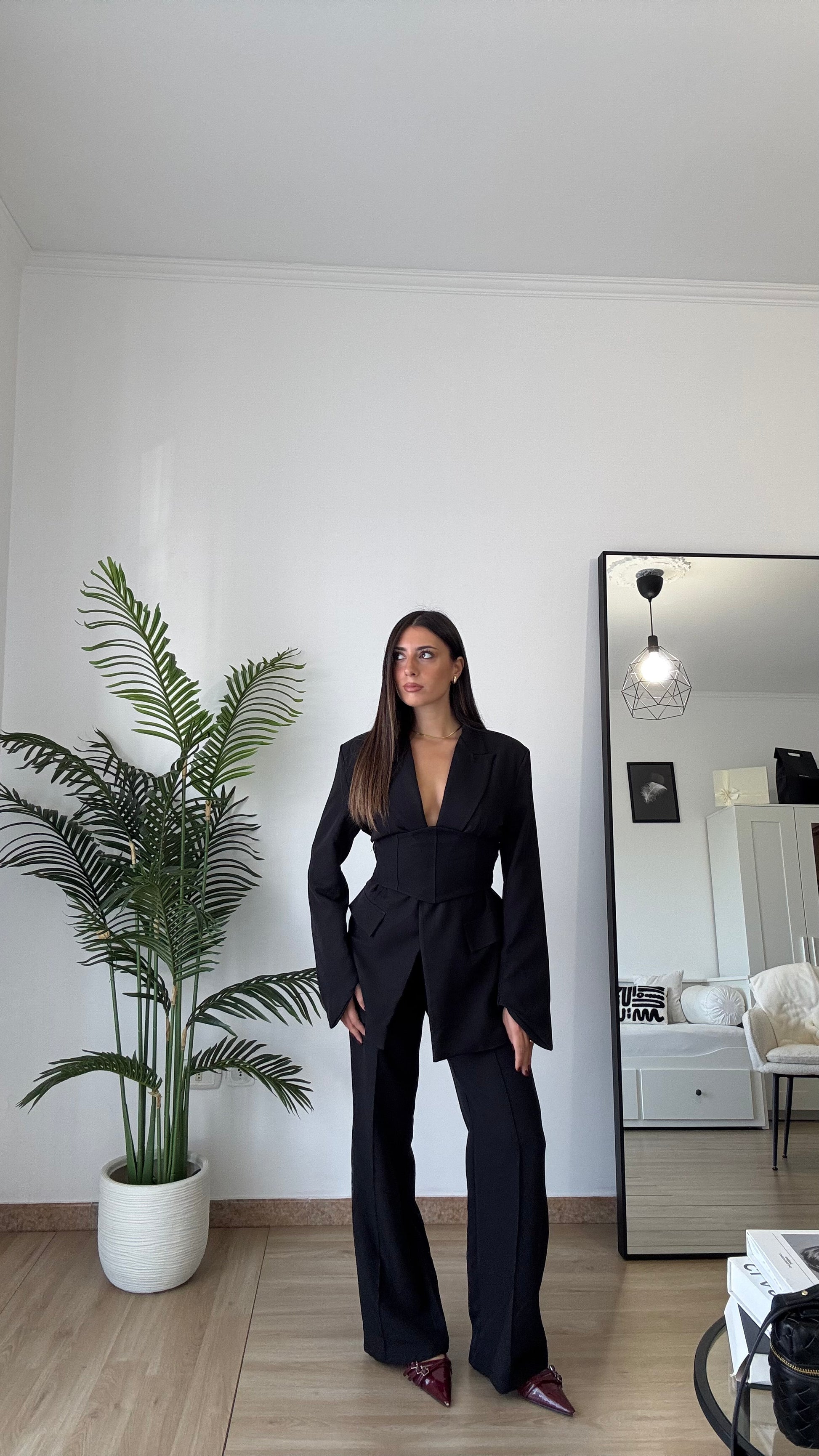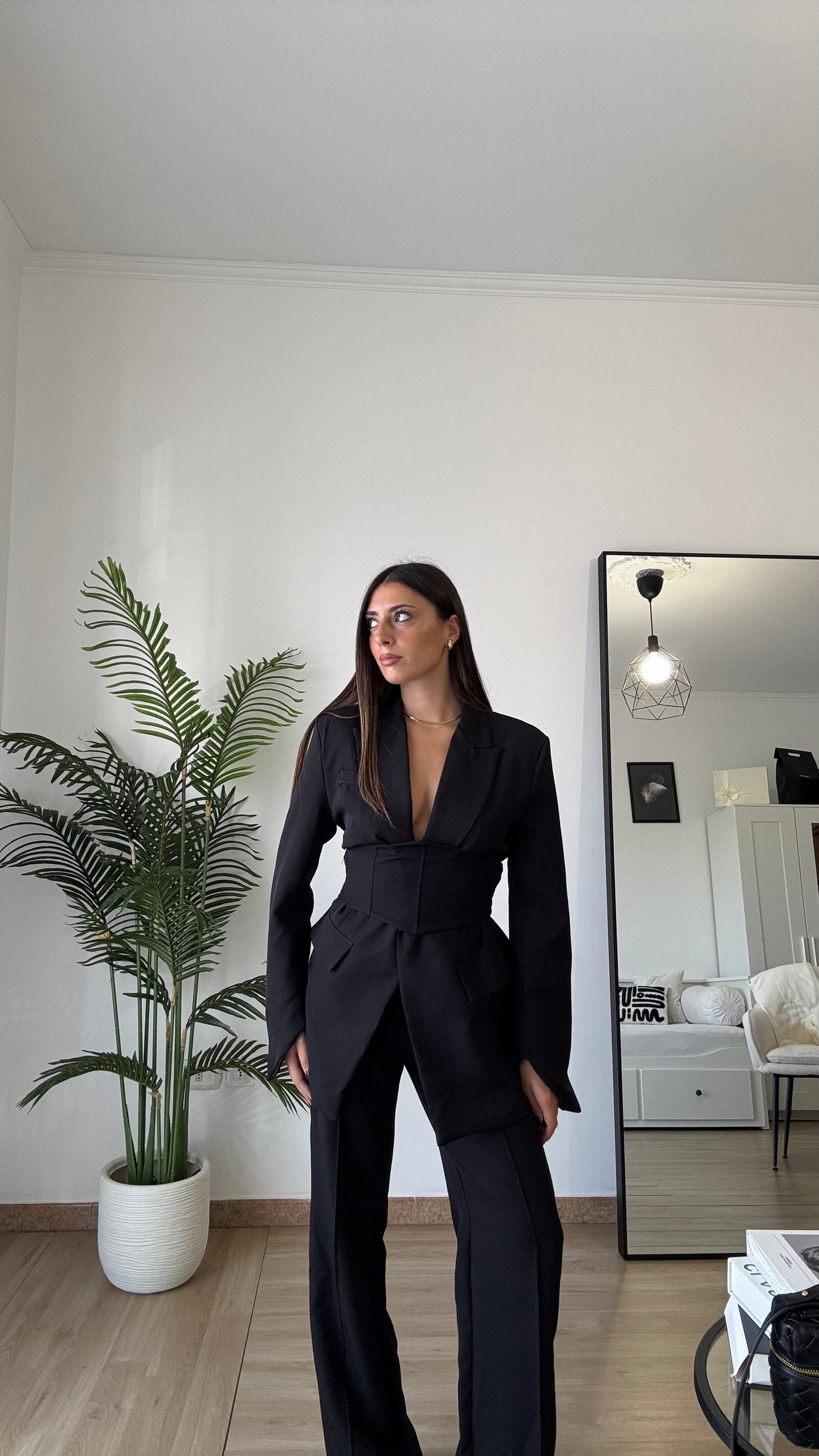 Tailleur composto da 3 pezzi, blazer con spalle imbottite mini corsetto con cerniera removibile , e pantalone con elastico sul retro, taglia unica 36/44.